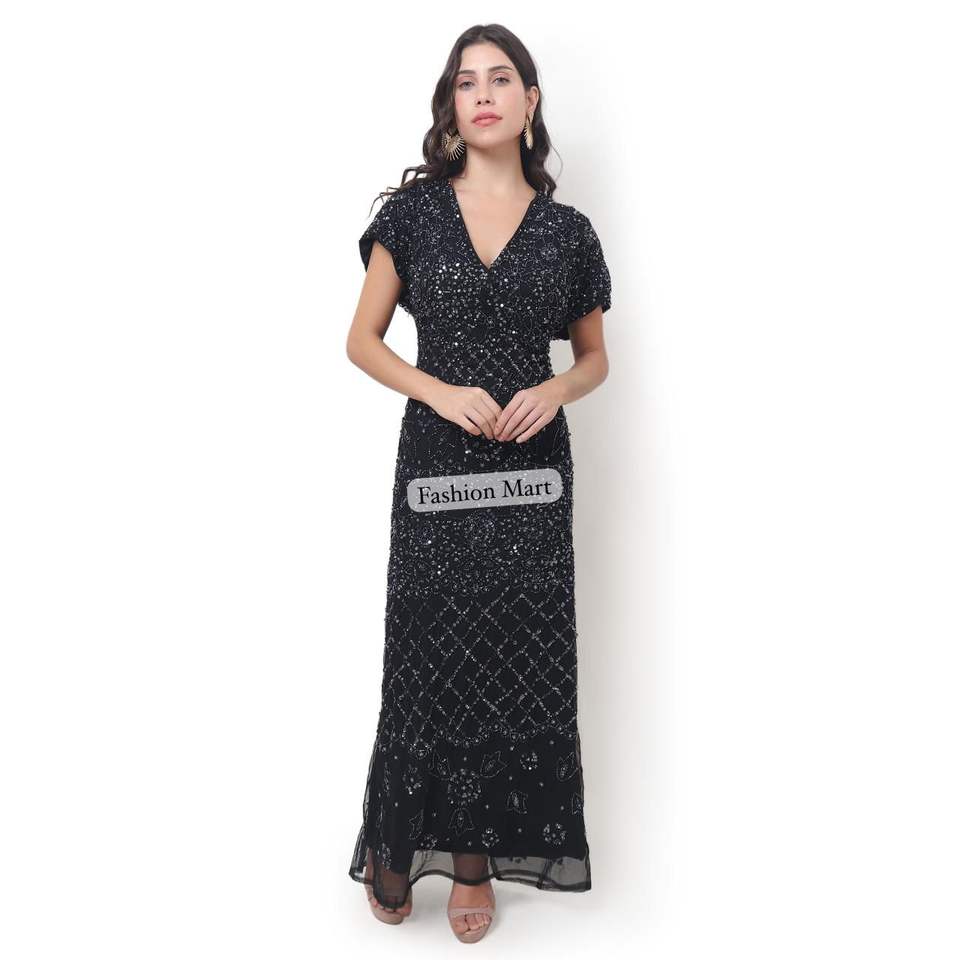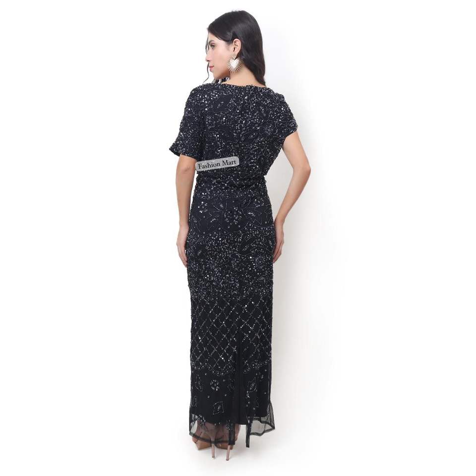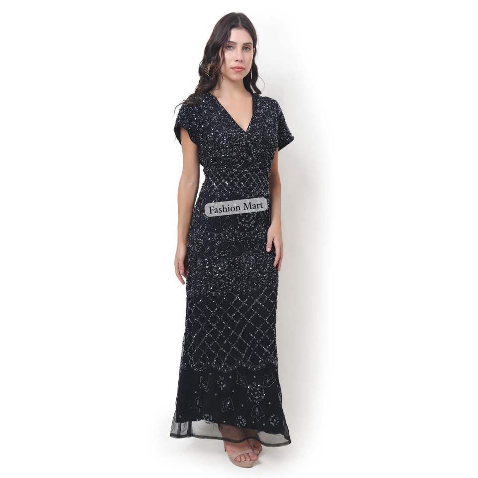 ชุดราตรีสีดำประดับลูกปัดทำมือสุดหรูสำหรับผู้หญิง คอวีทรงยาว พร้อมงานปักเลื่อมประณีต
