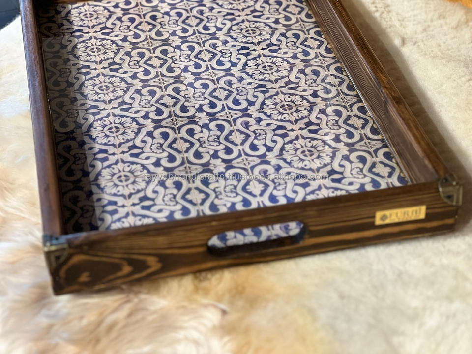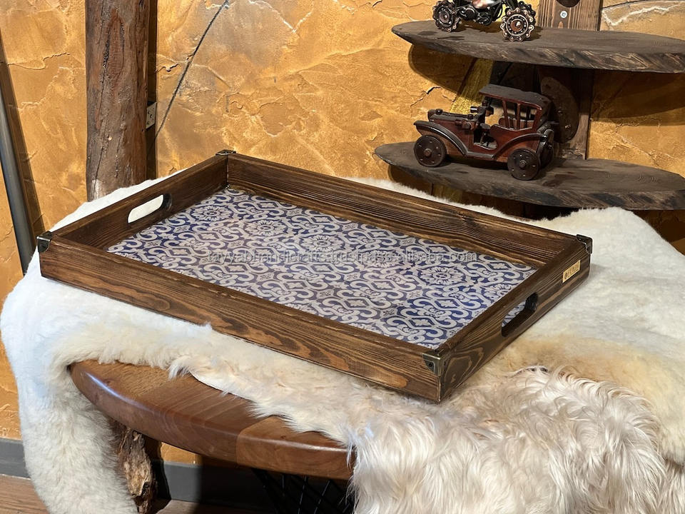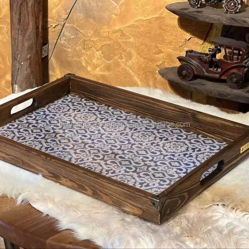 ถาดไม้สี่เหลี่ยมผืนผ้าแกะสลักด้วยมืออย่างประณีต เป็นมิตรกับสิ่งแวดล้อม จากประเทศอินเดีย สำหรับเสิร์ฟอาหารและตกแต่งบ้าน