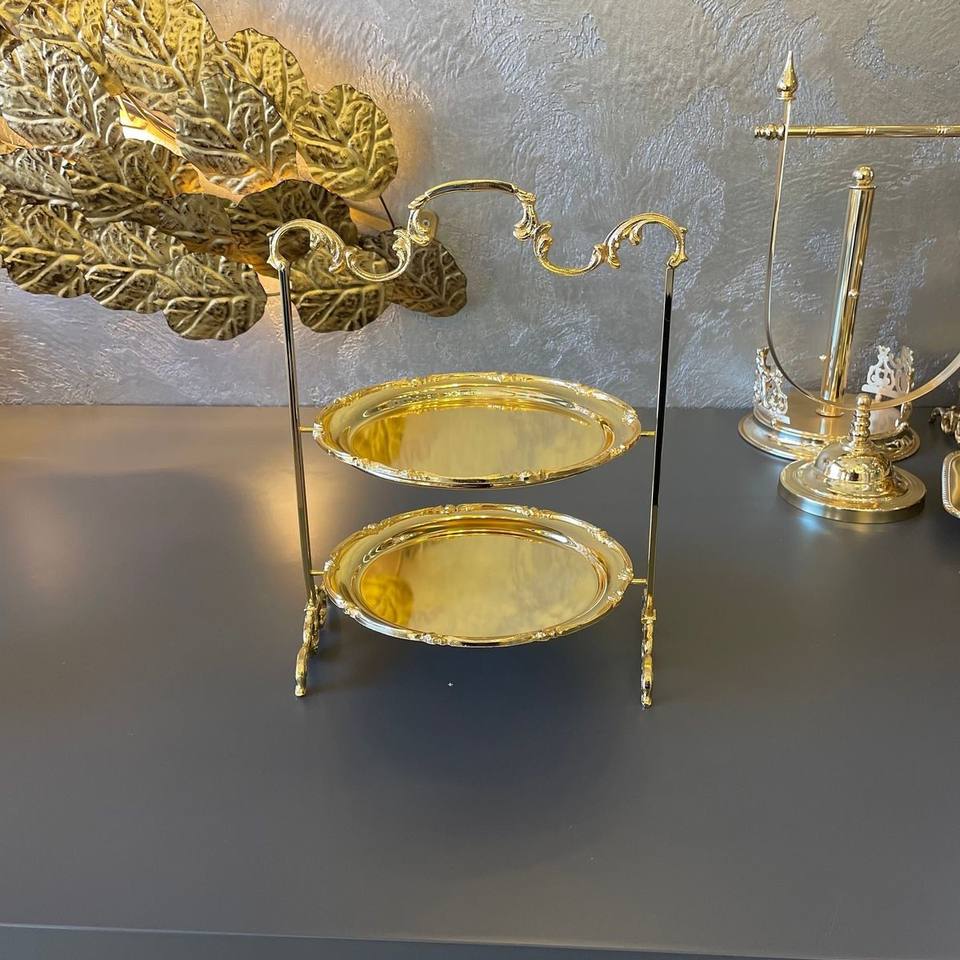 ขาตั้งเค้กทองเหลืองทำมือสุดหรู พร้อมจานสองชั้นและหูจับ สำหรับตกแต่งโต๊ะอาหารสุดหรู บ้าน โรงแรม ร้านอาหาร