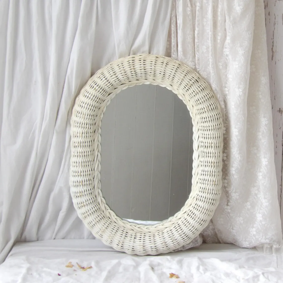 กระจกติดผนังทรงรีหวายถักลายหรูหราพร้อมกรอบถักสำหรับตกแต่งสไตล์ชายทะเลและโบฮีเมียน