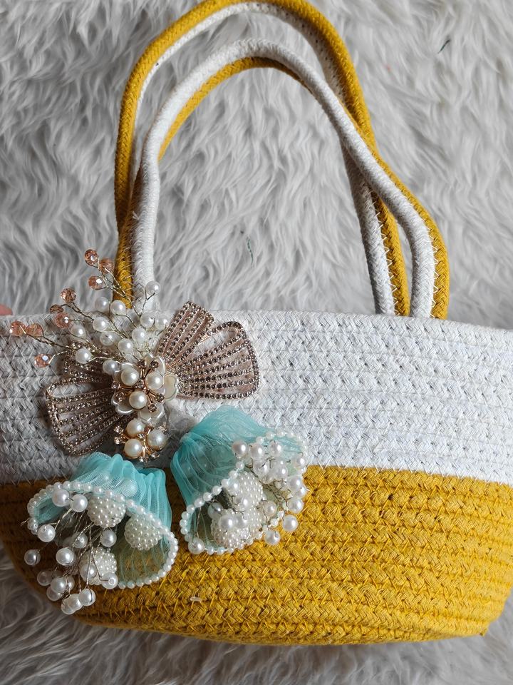 กระเป๋าถือสานด้วยมือสุดหรูหรา ประดับโบว์มุกและเข็มกลัดเพชร กระเป๋าสะพายไหล่สำหรับฤดูร้อนสุดเก๋ เหมาะสำหรับวันหยุดพักผ่อน