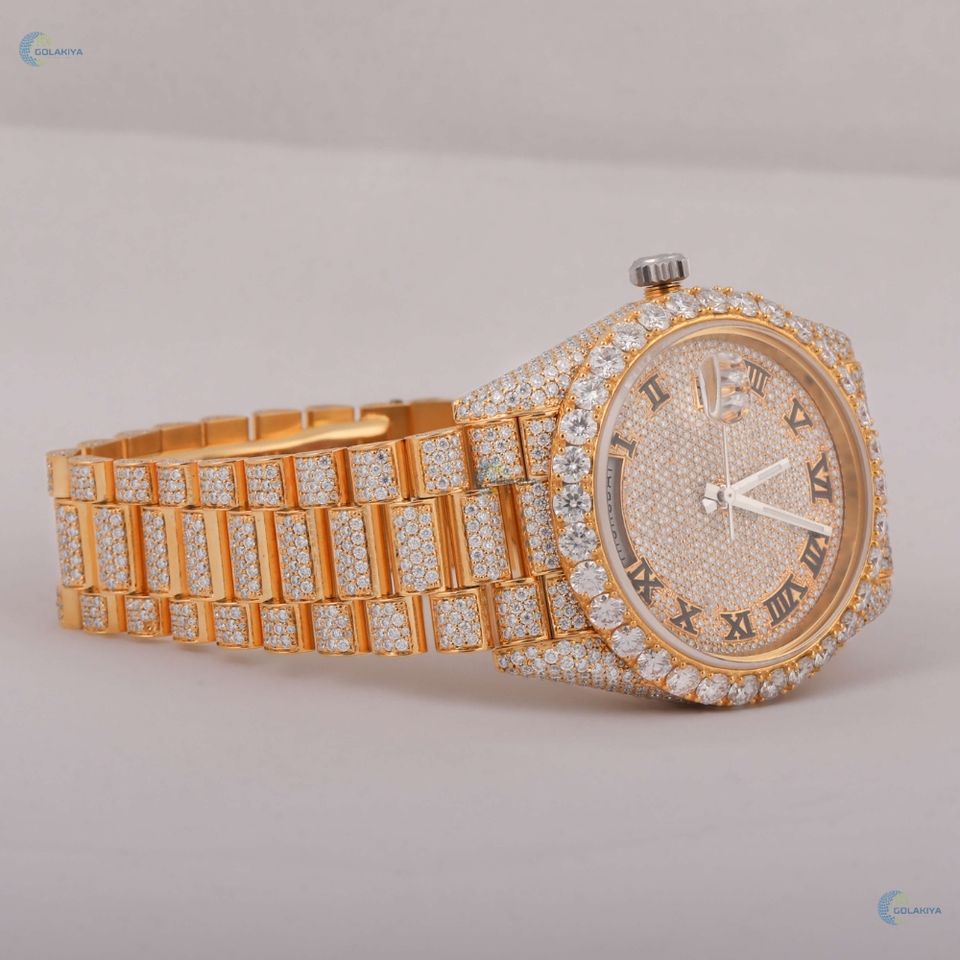นาฬิกาสุดหรูสำหรับผู้ชายหน้าปัดสไตล์โรมันพร้อมแสดงวันที่นาฬิกากำหนดสีทองพร้อมนาฬิกาเพชรโมอิสซาไนต์