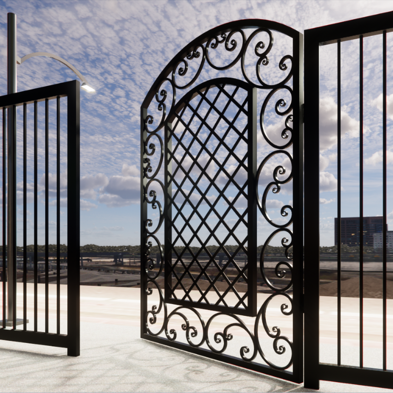 การออกแบบประตูเหล็กที่สวยงามสำหรับตกแต่งด้วยโลหะโครงเหล็กที่แข็งแรงเป็นมิตรกับสิ่งแวดล้อมการสร้างแบบจำลอง3D ความสูง7ft สำหรับทางเข้าบ้านที่ทันสมัย