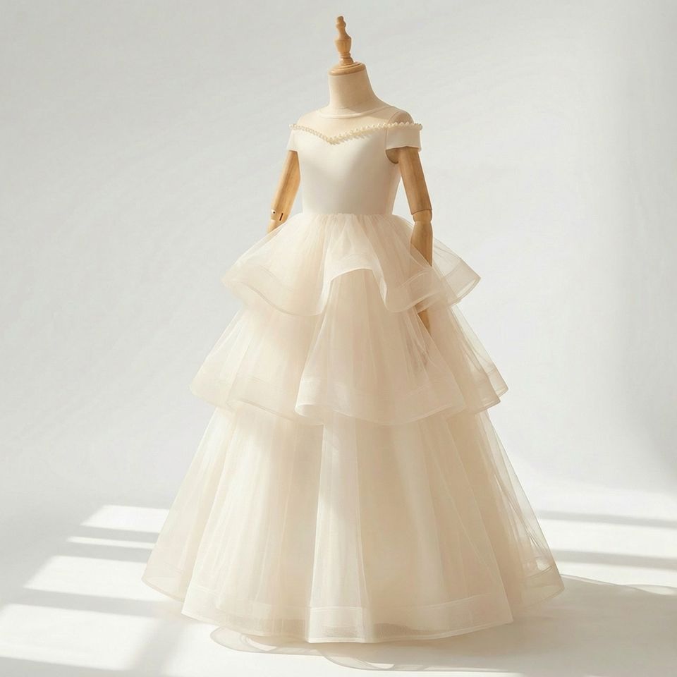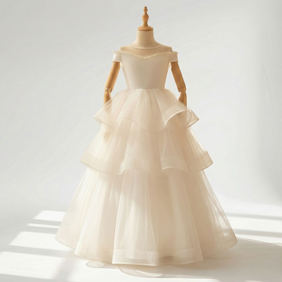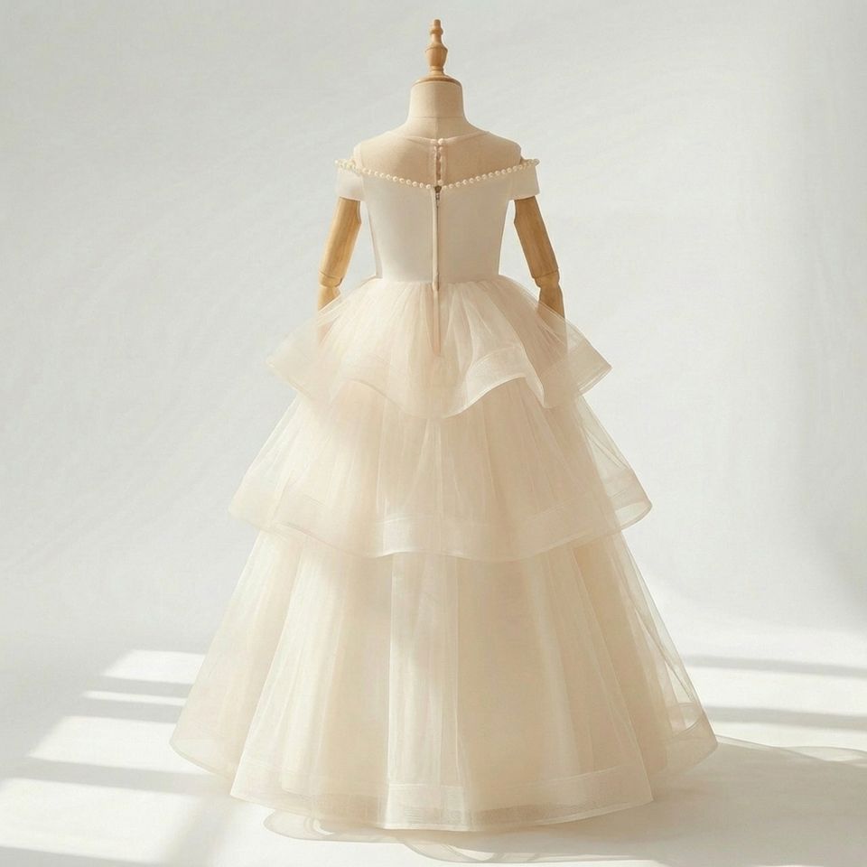 ชุดเดรสเด็กผู้หญิงสีงาช้างหรูหราแบบเปิดไหล่พร้อมชายกระโปรงยาวสำหรับงานแต่งงานและพิธีการสุดหรู