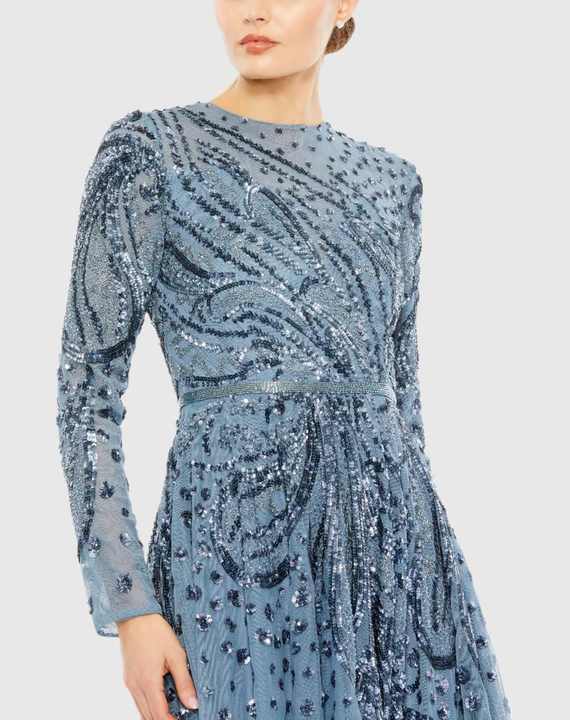ชุดเดรสชีฟองทรงเอไลน์ยาวระดับเข่า ดีไซน์แขนยาว เปิดหลัง ประดับลูกปัดคริสตัล ป้องกันไฟฟ้าสถิต คอทรงโอ 100%