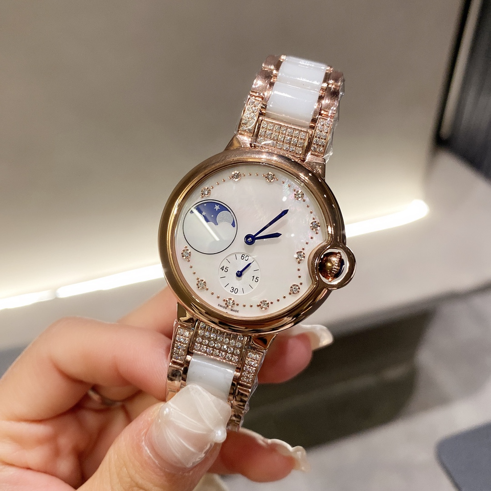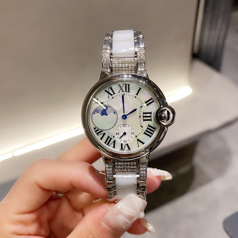 นาฬิกาสำหรับสุภาพสตรีสุดหรู สายเซรามิก-โลหะสีขาว ประดับเพชร หน้าปัดมุกพร้อมตัวเลขโรมัน แสดงข้างขึ้นข้างแรม