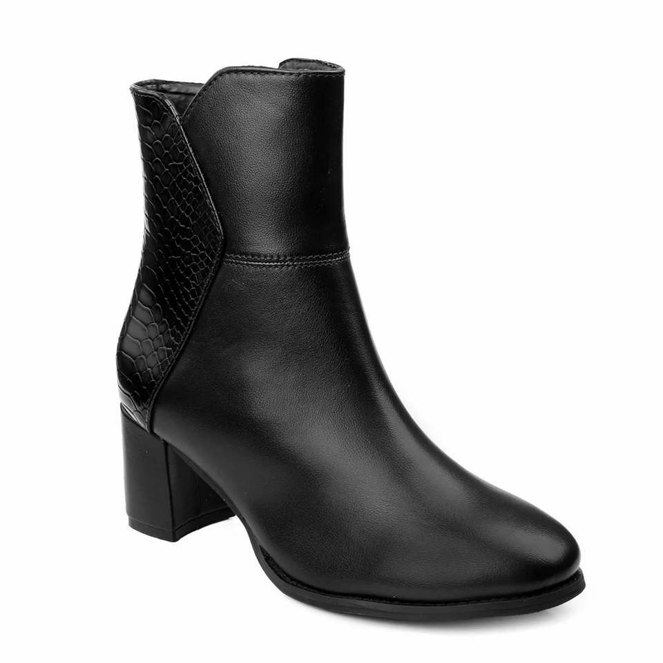 รองเท้าบูทส้นสูงแบบมีซิปสำหรับผู้หญิง ดีไซน์หรูหรา หนัง PU ด้านบน พื้นรองเท้าหนังแท้ ส้นหนา รุ่นใหม่ พร้อมหัวเข็มขัดแบบซิปสุดพิเศษ