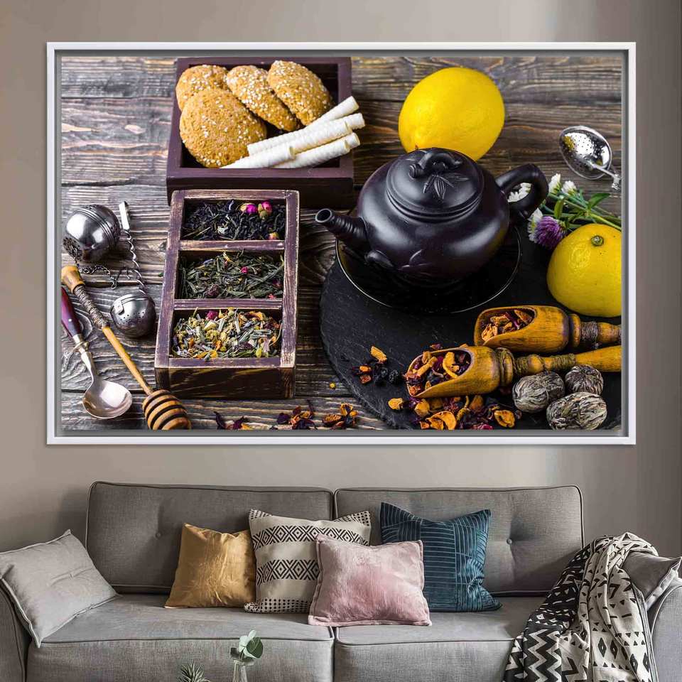 Elegant Lemon & Teapot Kitchen Decor Printed Canvas Wall Art,WHITE FRAMED CANVAS