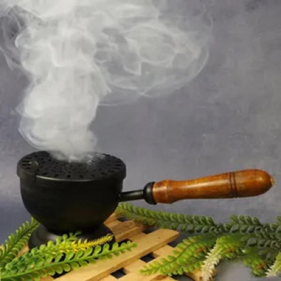 เตาเผาเครื่องหอมเหล็กหล่อ ดีไซน์หรูหรา สีดำสไตล์เรโทร พร้อมงานฝีมือประณีตและด้ามจับไม้ เหมาะสำหรับตกแต่งบนโต๊ะ
