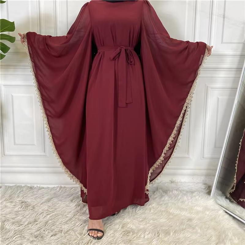 เดรสอาบายาทรงหลวมหรูหราพร้อมแขนผีเสื้อและสายผูกเอวสีเบจสีน้ำตาลอมเทาสำหรับอิสลามที่เป็นทางการ