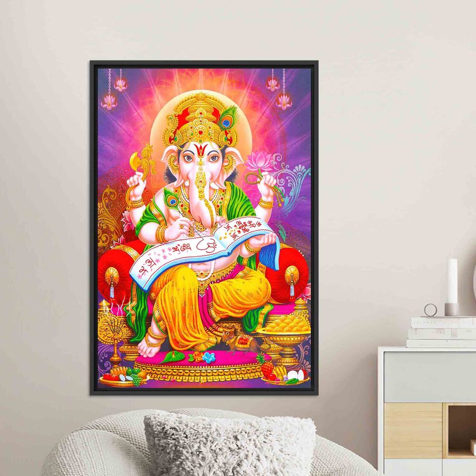 ภาพพิมพ์บนผ้าใบพระพิฆเนศที่สง่างาม ศิลปะตกแต่งแบบนามธรรมสมัยใหม่ กรอบสีดำ