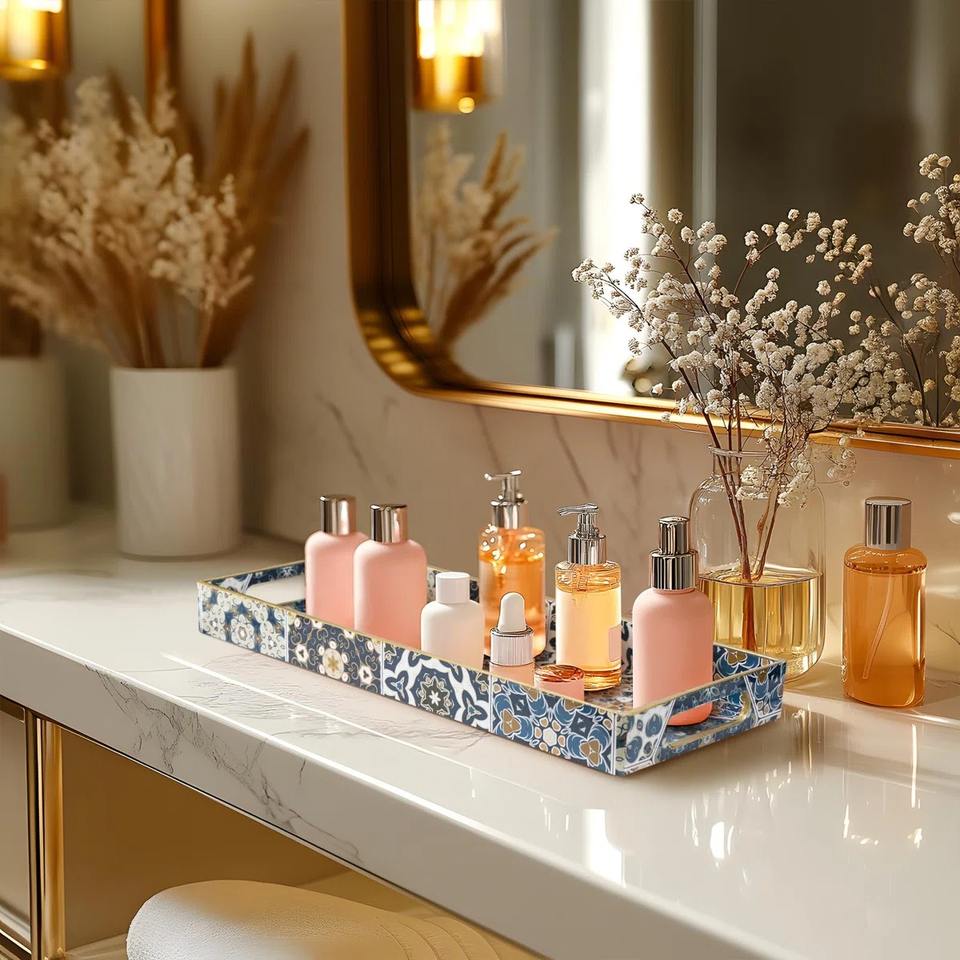 ถาดวางของสี่เหลี่ยมสแตนเลสลายแมนดาลาสุดหรู ขอบสีทอง ช่องเดียว ตกแต่งห้องนั่งเล่นสไตล์โบโฮ ห้องน้ำ