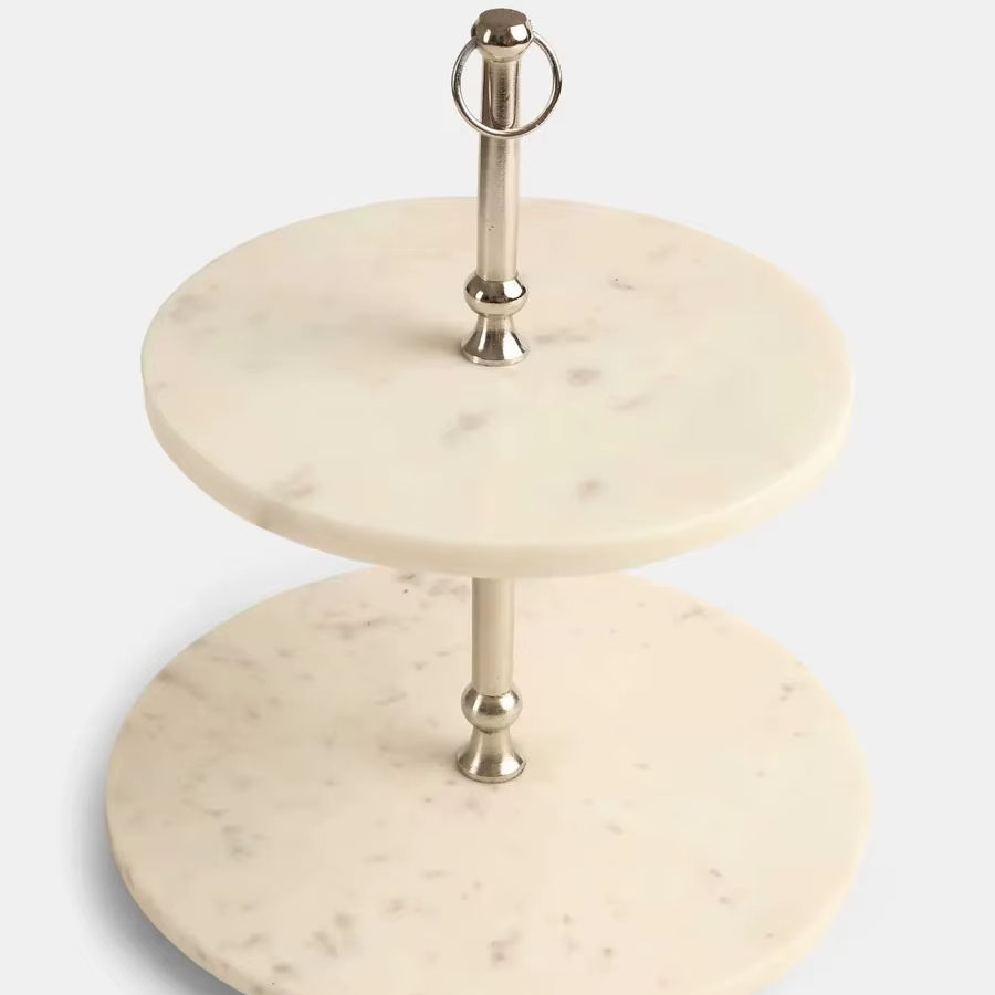 ชั้นวางขนม 2 ชั้น หินอ่อนหรูหรา พร้อมหูจับโลหะ ถาดขนมหวานสุดหรู ทนทาน เหมาะสำหรับห้องครัวและตกแต่งบ้าน