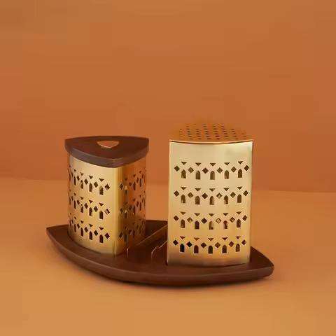 Elegant Middle Eastern Home Decor Set Laser Cut Gold Metal Mubkhar & Premium Navy Leather Notebook Bukhoor Burner Set for Office