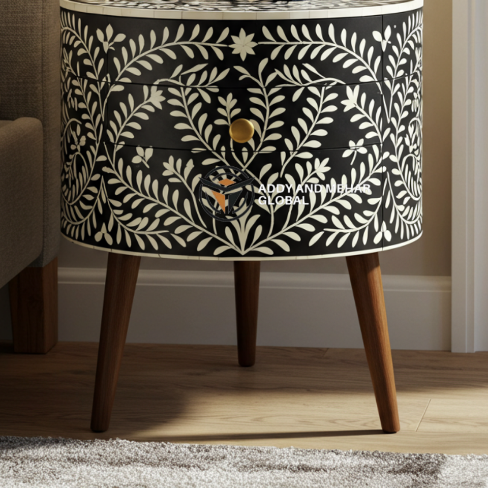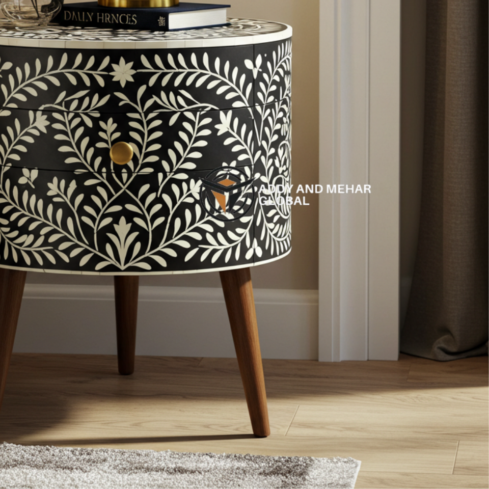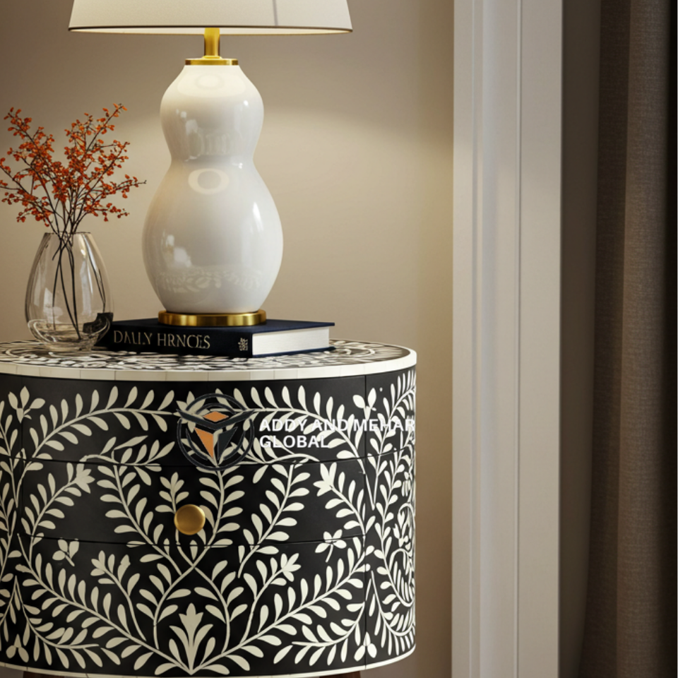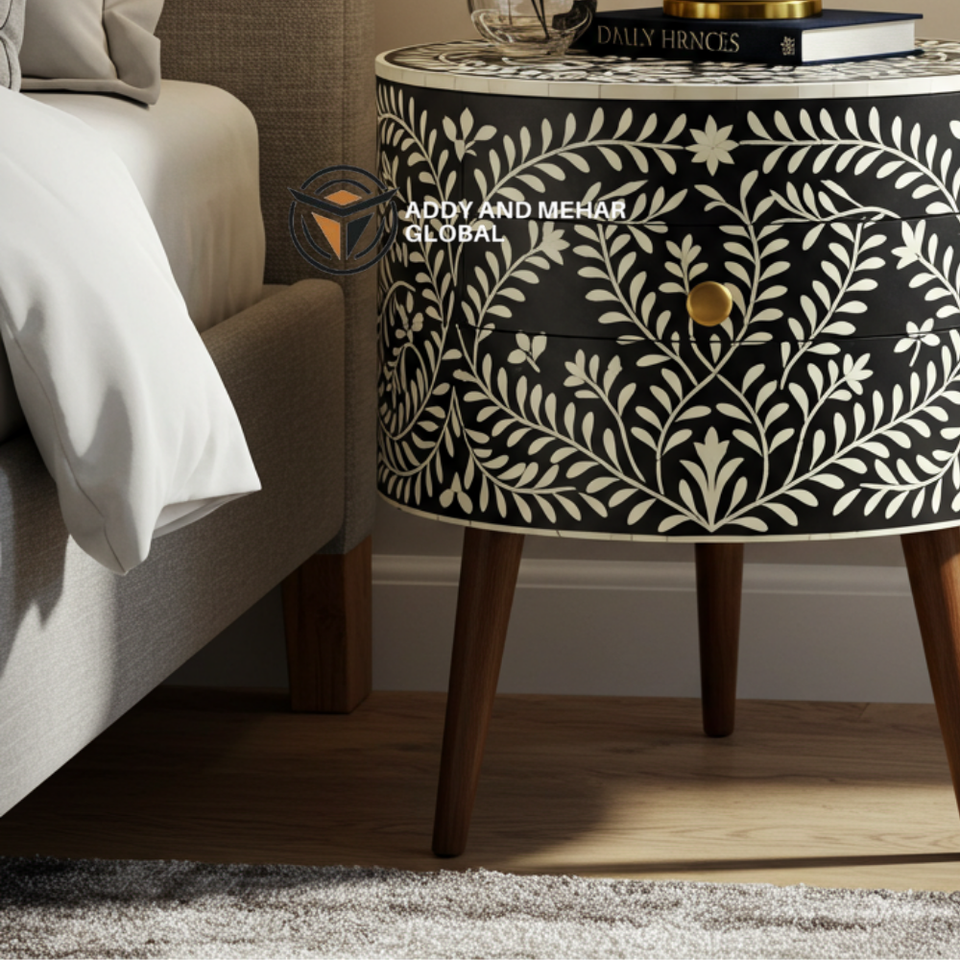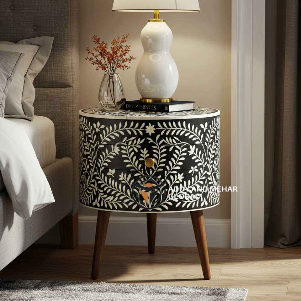 โต๊ะข้างเตียงไม้ทรงกลม ดีไซน์หรูหราทันสมัย ประดับลายดอกไม้สีดำ งานฝีมือ ผลิตจากวัสดุที่เป็นมิตรต่อสิ่งแวดล้อม