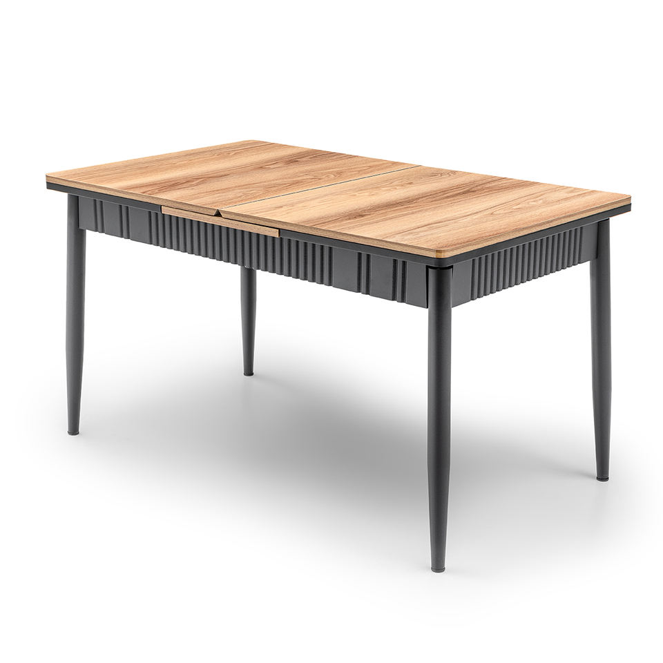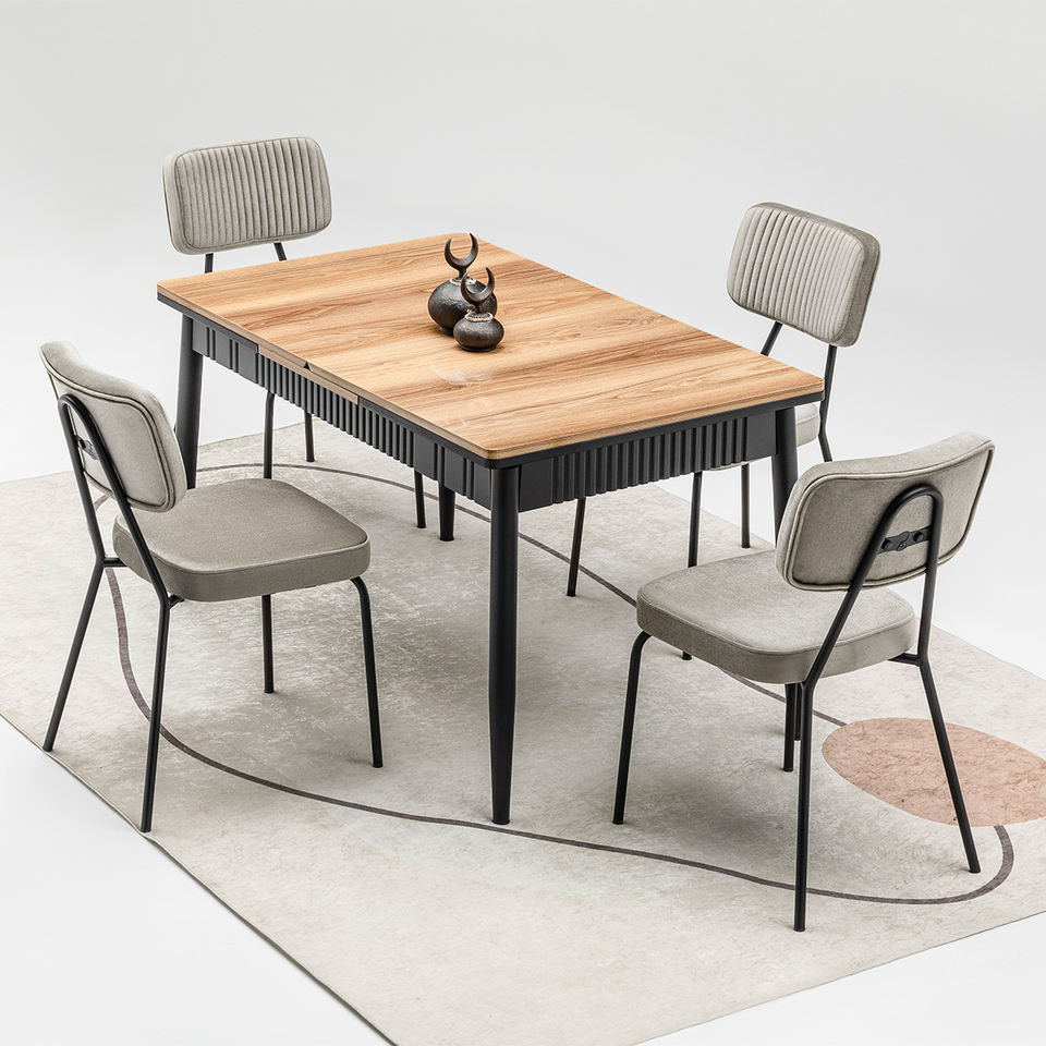 ชุดโต๊ะรับประทานอาหารทรงสี่เหลี่ยมหรูหราทันสมัยปรับขยายได้พร้อมเก้าอี้หุ้มด้วยไม้โครงโลหะมีสไตล์สำหรับใช้ในบ้านคาเฟ่