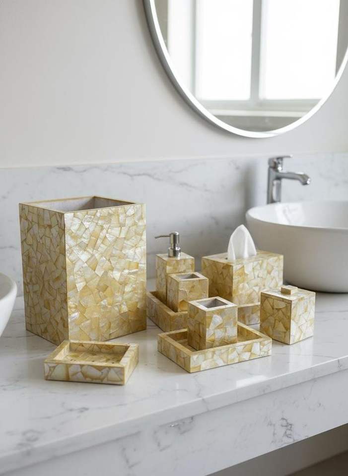 ชุดอุปกรณ์ห้องน้ำหรูหราประดับมุกเปลือกหอย สำหรับตกแต่งเคาน์เตอร์ห้องน้ำสุดหรู พร้อมงานฝังมุกทำมือ และคุณภาพระดับพรีเมียม