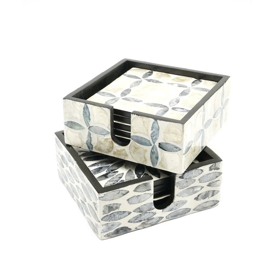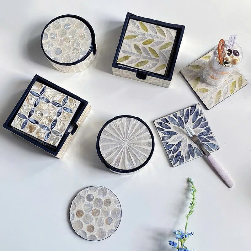 ชุดจานรองแก้วตกแต่งลายมุกและไม้สุดหรู บรรจุในกล่องของขวัญพรีเมียม สำหรับตกแต่งบ้านสุดหรู รับผลิตแบบ OEM ODM ขายส่ง