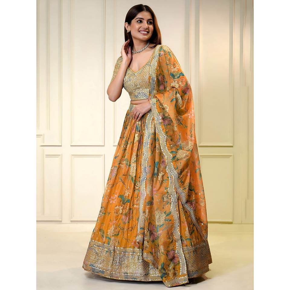 ชุดเลเฮนกาทรงเอไลน์ยาวกรอมพื้น ลายดอกไม้หลากสีสัน ผ้าออร์แกนซ่า ประดับเลื่อมละเอียด ปักดิจิตอล สำหรับงานกลางคืน