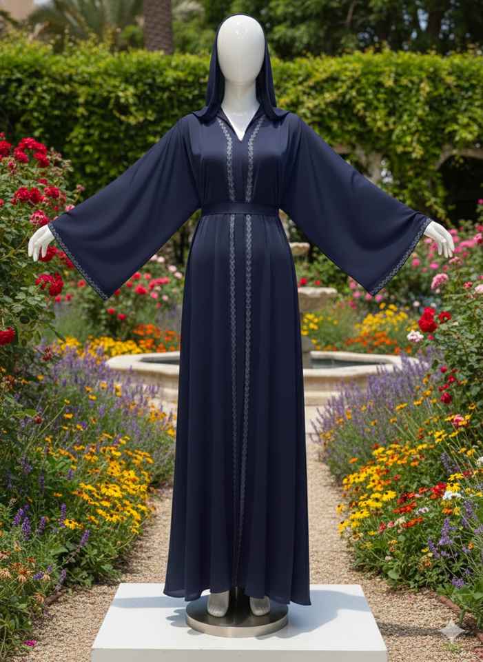 ชุดกิโมโนอาบายะสีน้ำเงินกรมท่าสุดหรู ประดับคริสตัล แขนเสื้อทรงแองเจิลพลิ้วไหว พร้อมฮิญาบเข้าชุด - ชุดคาฟตันสำหรับงานกลางคืนแบบเรียบร้อย