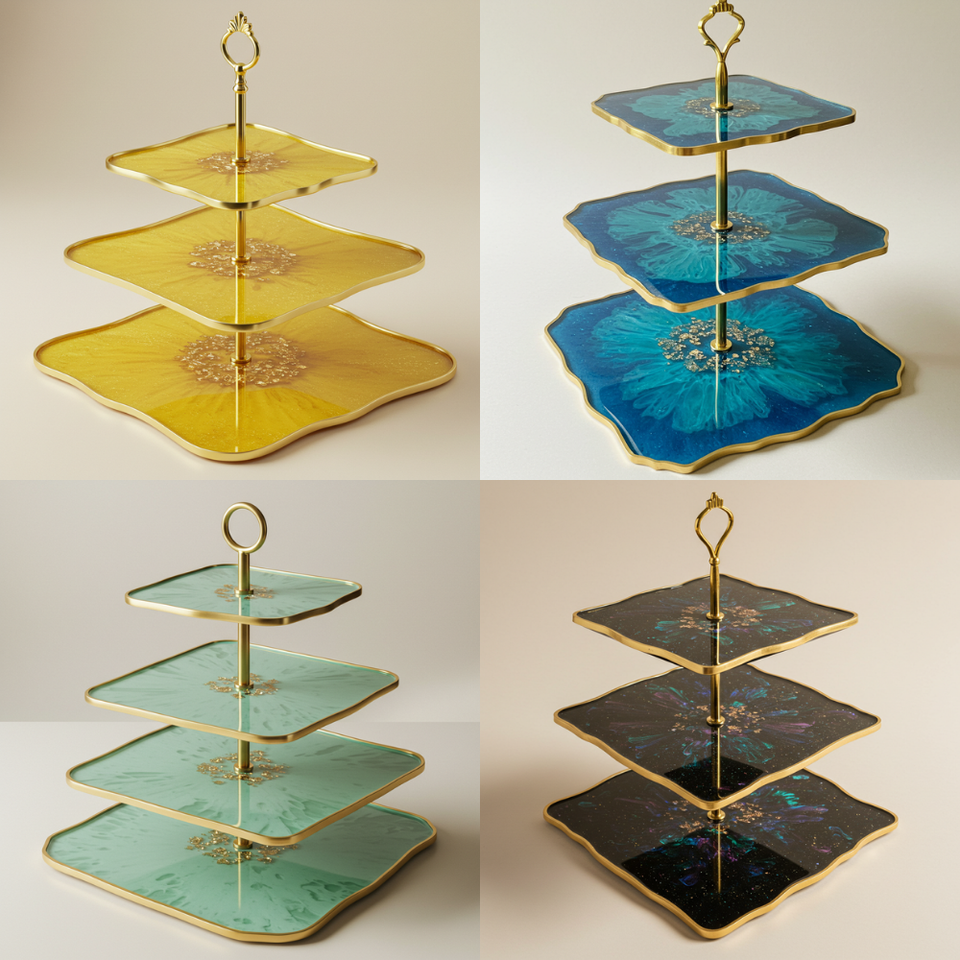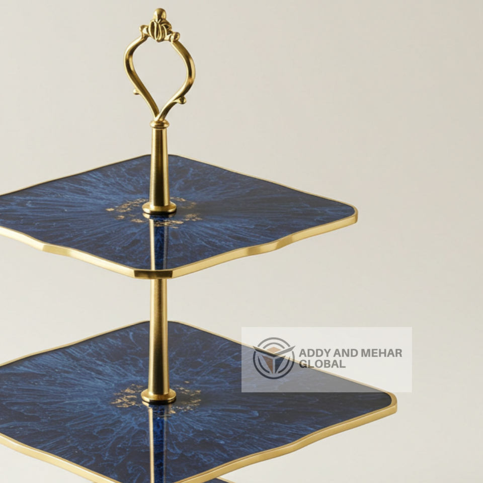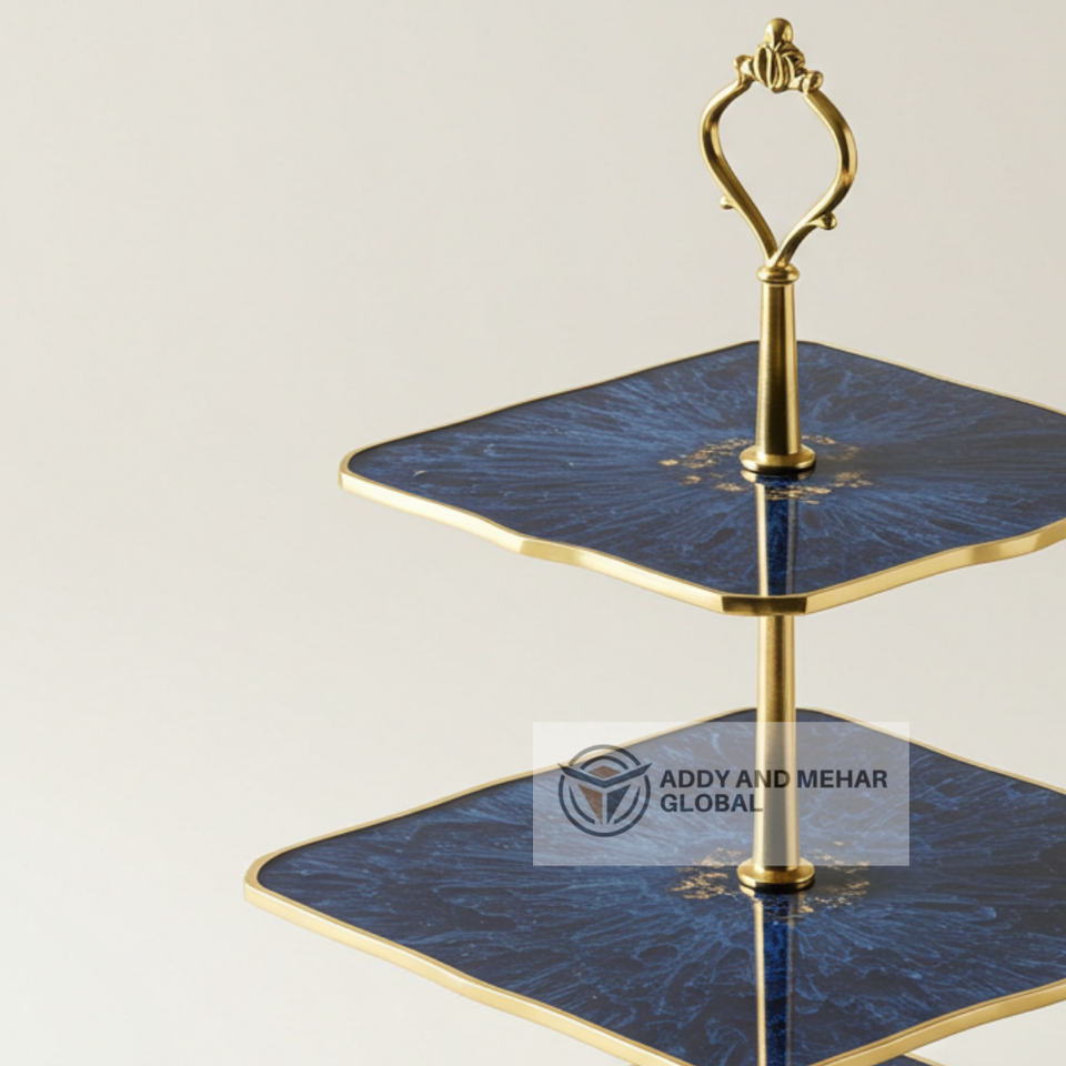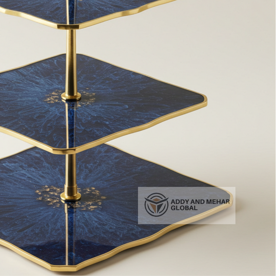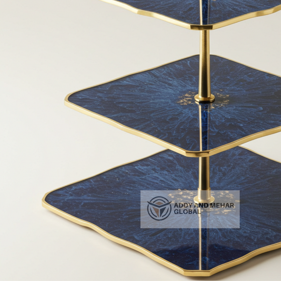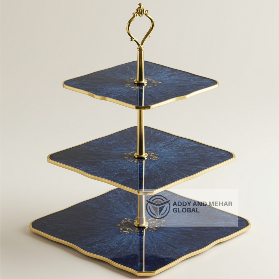 ถาดเสิร์ฟขนม3ชั้นทำด้วยมือทำจากเรซินสีน้ำเงินเข้มหรูหราสำหรับงานเบเกอรี่งานแต่งงาน