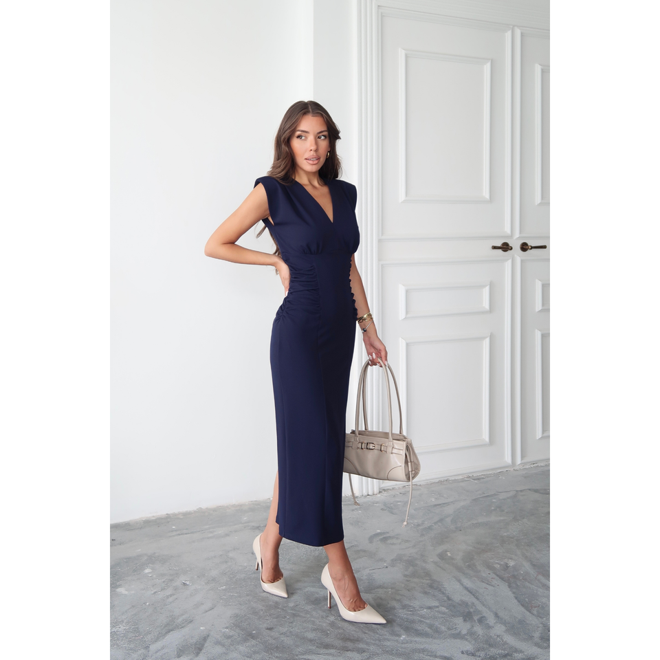 เดรสสีน้ำเงินกรมท่า คอวี ทรงสกูบา แต่งระบายด้านข้าง ความยาวปานกลาง เหมาะสำหรับใส่ทำงาน ไซส์ S