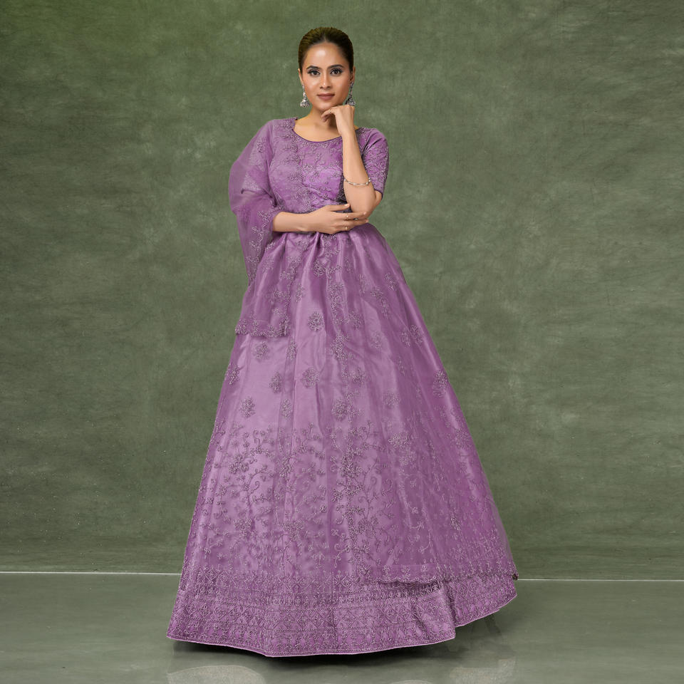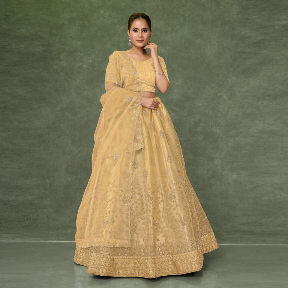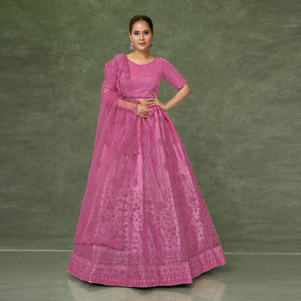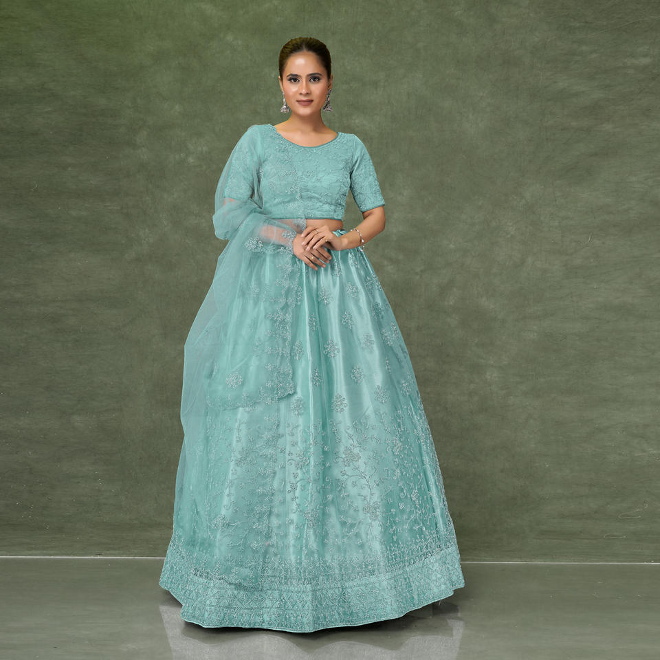 ชุดเลเฮนกาโชลีผ้าเน็ตสุดหรู พร้อมงานปักดิ้นประณีต กระโปรงทรงบานพลิ้วไหว ผ้าคลุมไหล่เนื้อนุ่มบางเบา ชุดสำหรับงานเทศกาลและงานพิธีต่างๆ