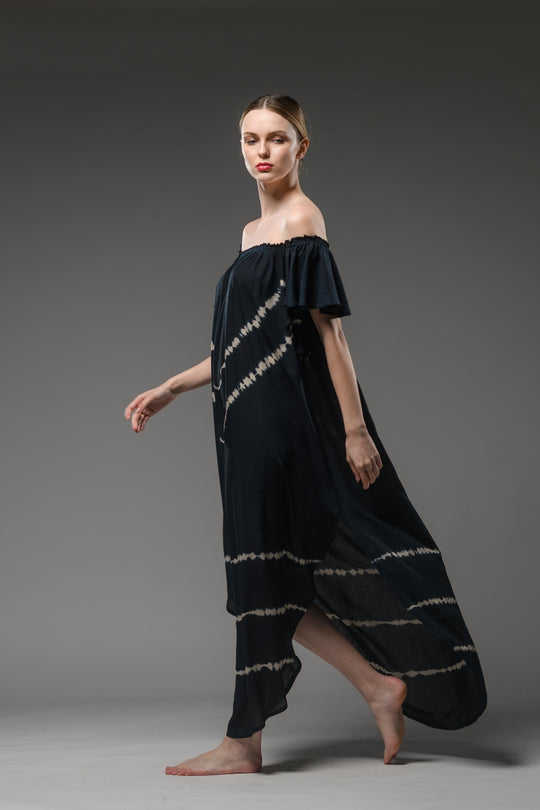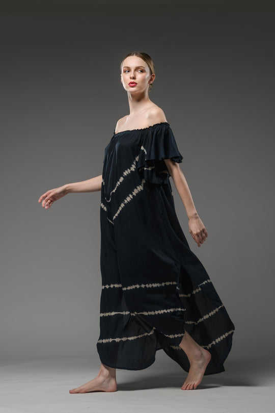 เดรสแม็กซี่เปิดไหล่สีดำหรูหราสำหรับผู้หญิงดีไซน์มีระบายและแม็กซี่มีจีบสีดำสำหรับงานปาร์ตี้แบบลำลอง