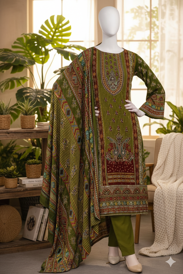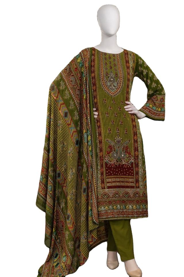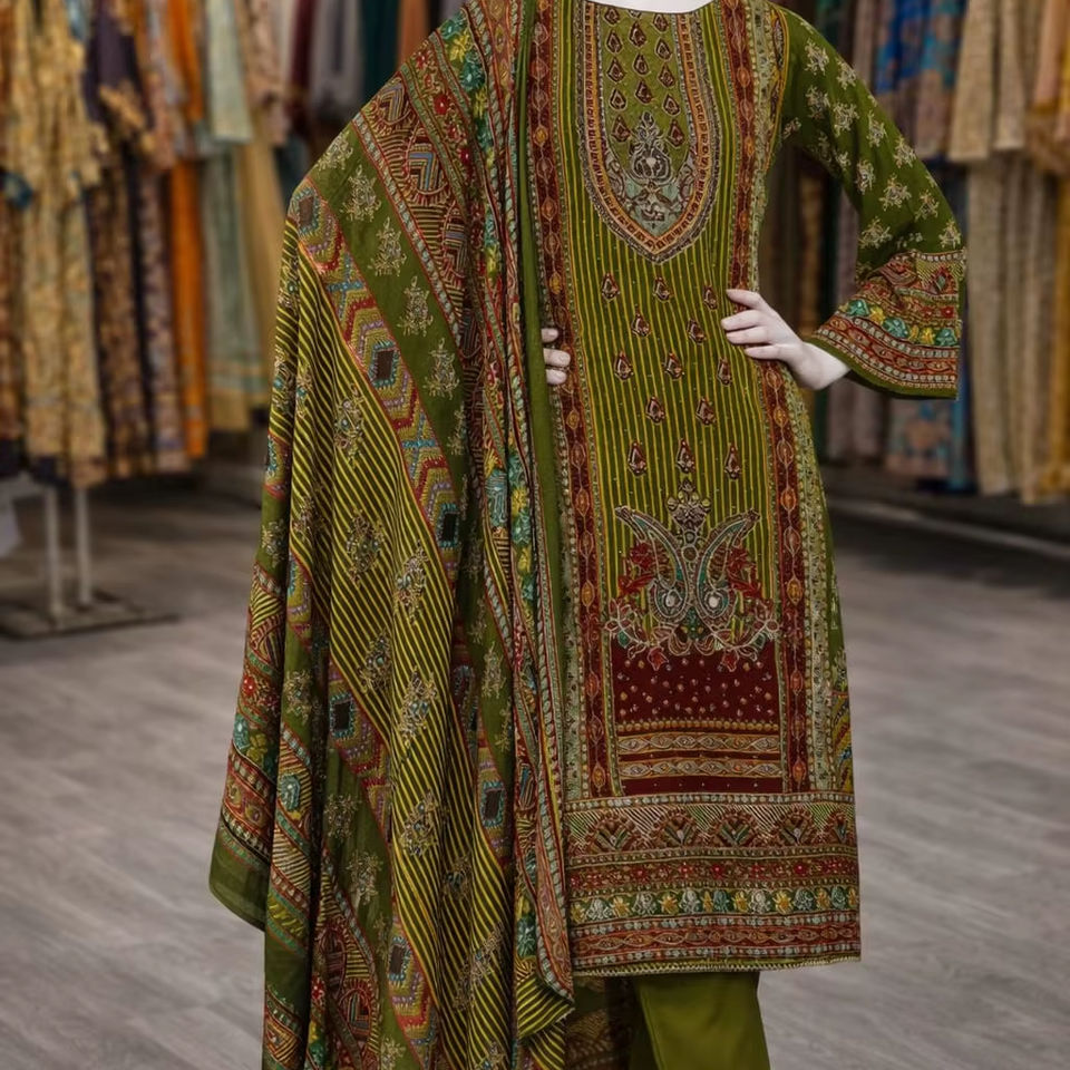 ชุดสาหรี่กะมีซสีเขียวมะกอกแบบปากีสถานพิมพ์ลายสวยงาม ยาวถึงพื้น พร้อมผ้าคลุมไหล่ลายประณีต เหมาะสำหรับงานปาร์ตี้ ชุดพื้นเมืองแบบดั้งเดิม