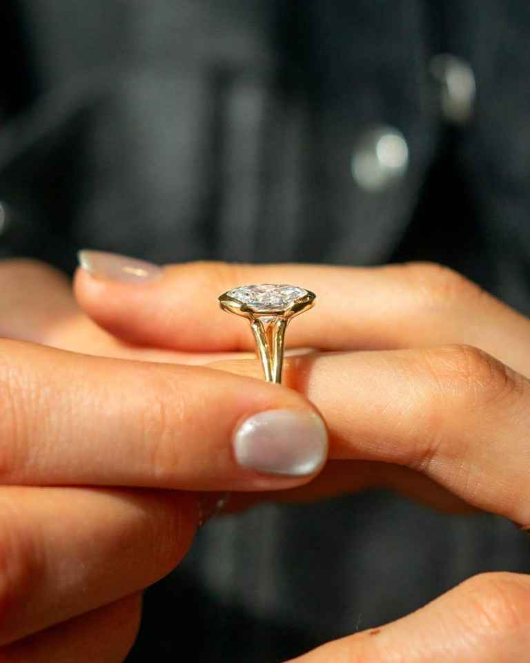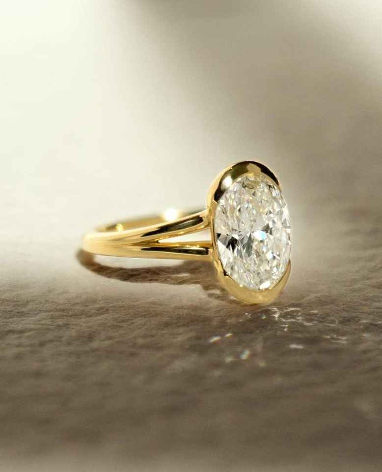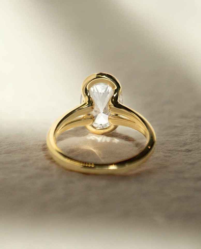 แหวนมอสซาไนต์ทรงรีหรูหราประดับครึ่งวงแบบเบเซลในทองคำขาว 14K | แหวนหมั้นทรงเรียบหรูแบบโซลิแทร์ | เครื่องประดับชั้นสูงร่วมสมัยสำหรับเธอ