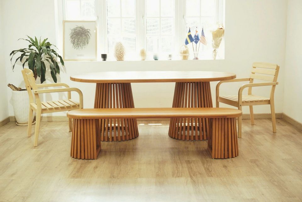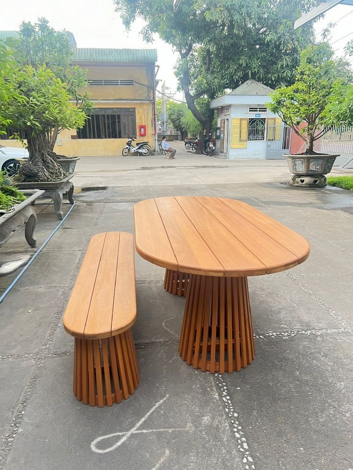 โต๊ะรับประทานอาหารกลางแจ้งทรงรีที่หรูหรา | แท่นไม้ทนทานแบบสองชั้นสำหรับลานระเบียงโรงแรมและวิลล่า | ผู้ผลิตเวียดนาม