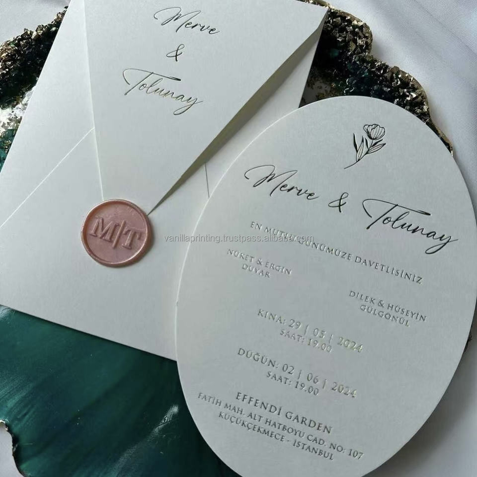การ์ดเชิญงานแต่งงานรูปวงรีหรูหรา ปั๊มฟอยล์ทอง พร้อมชื่อย่อแบบกำหนดเอง โลโก้สั่งทำพิเศษ พิมพ์ลายแบบกำหนดเองบนกระดาษหนาคุณภาพสูง