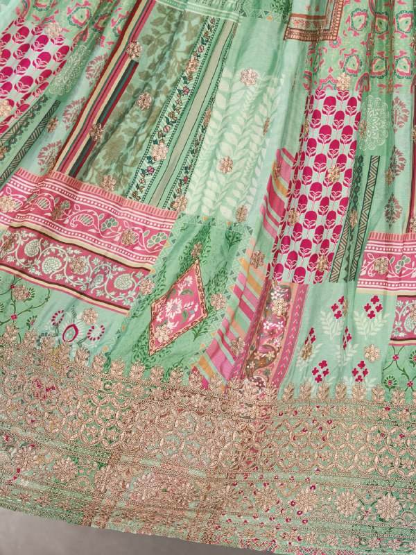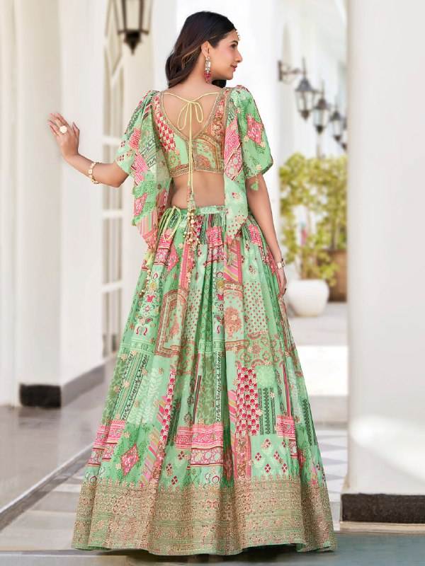 ชุดเลเฮนกาโชลีผ้าไหมชินนอนสีเขียวพาสเทลสุดหรู พร้อมเสื้อปักลายผ้าชีฟอง ผ้าคลุมไหล่แบบดูปัตตา สไตล์บอลลีวูด สำหรับงานปาร์ตี้ ความยาวคลุมเท้า สวมใส่ง่าย