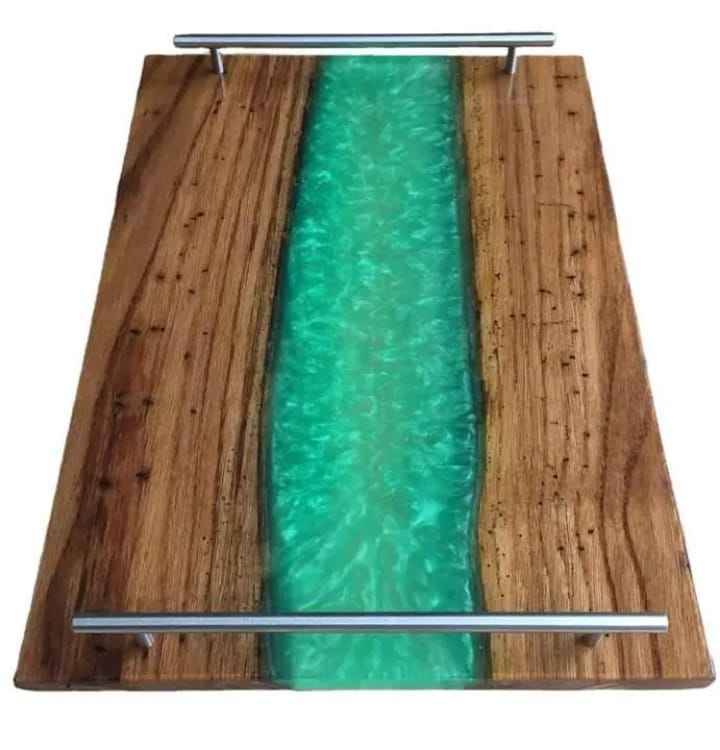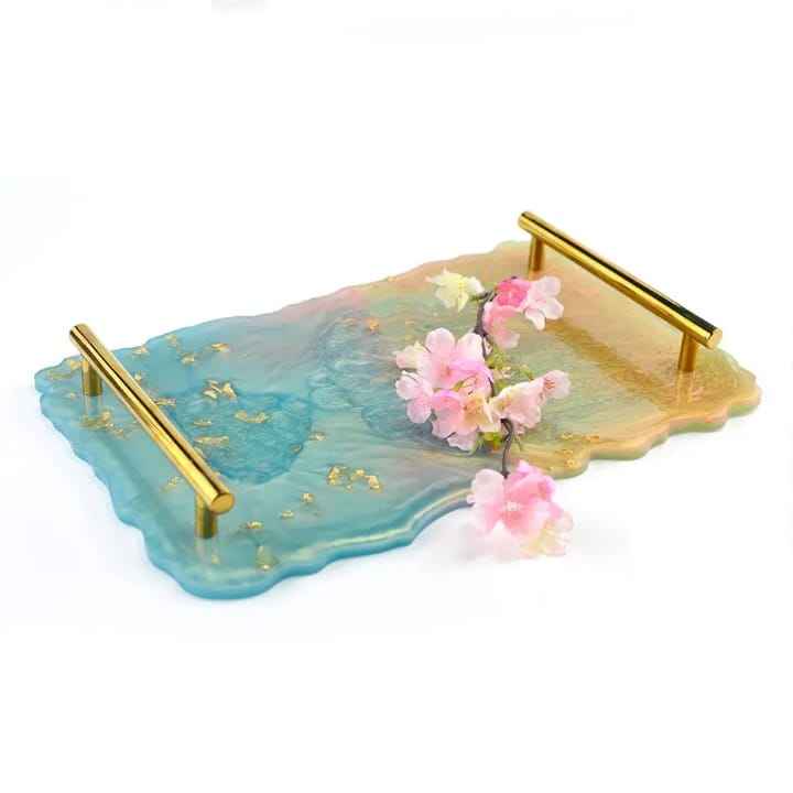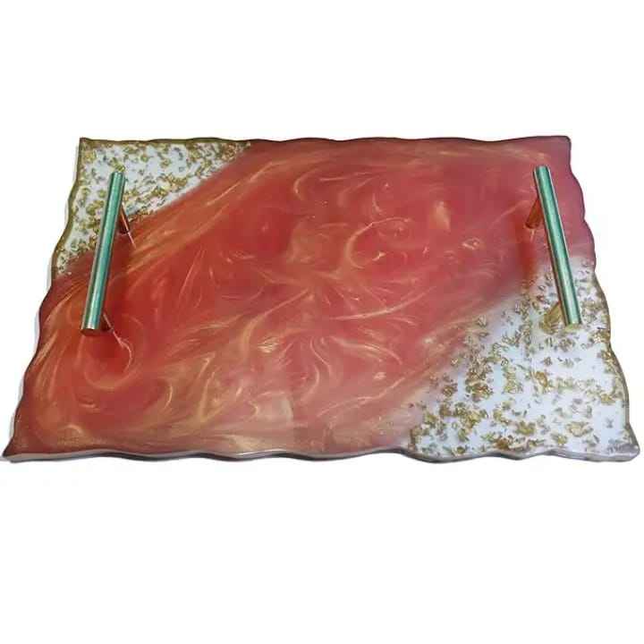 ถาดเรซิ่นลายจีโอดสีพีชสุดหรู พร้อมขอบฟอยล์สีทองแบบไม่สม่ำเสมอ มีหูจับ สำหรับตกแต่งงานแต่งงานและงานเลี้ยง
