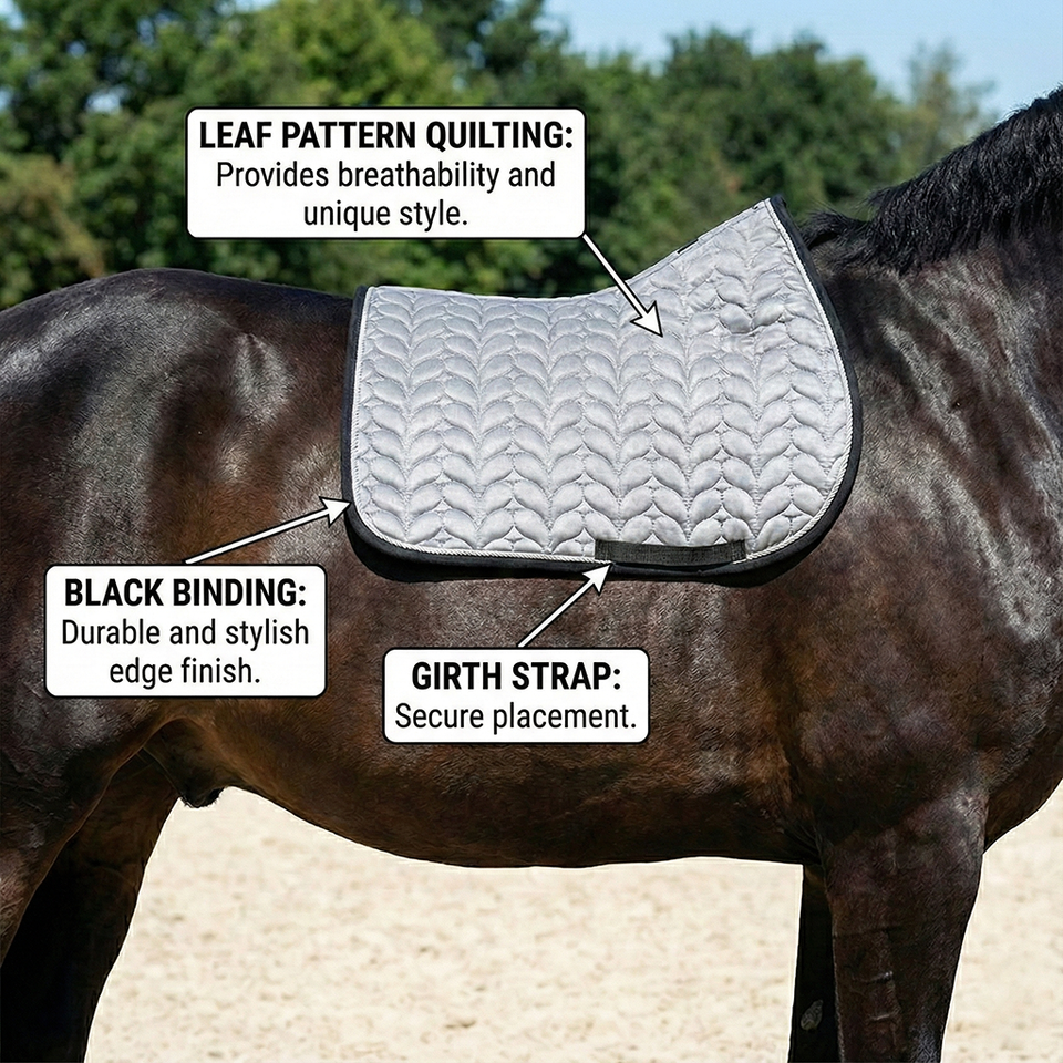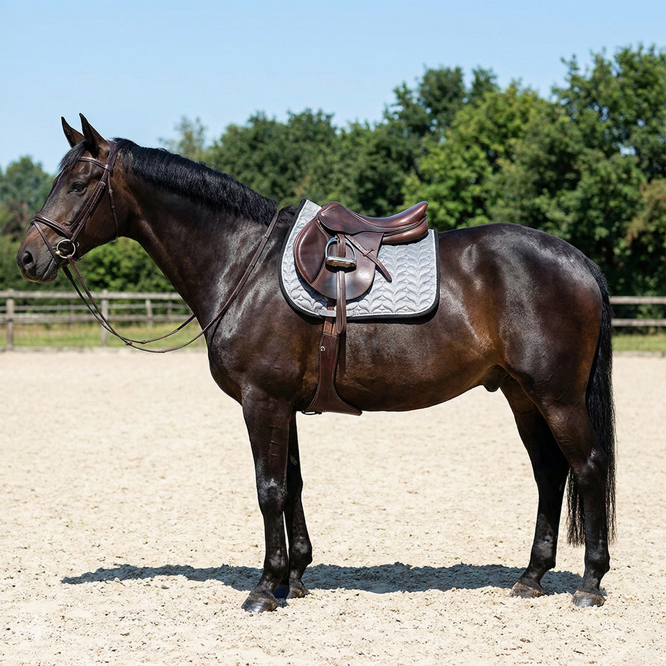 แผ่นรองอานม้าสีเทาไข่มุกแบบหรูหรา ดีไซน์โค้งรับหลังสูง ทนทานด้วยผ้าตาข่ายบุด้วยใยฝ้ายและโฟม พร้อมสายรัดป้องกันสำหรับม้า