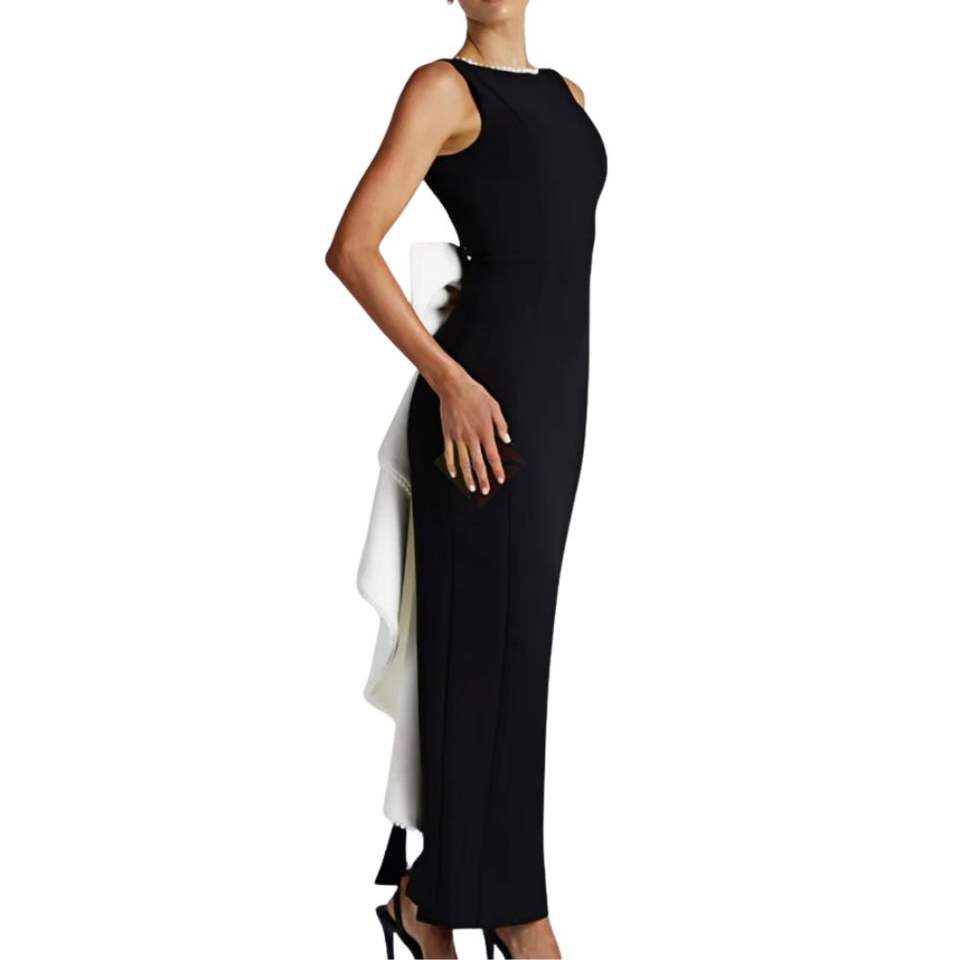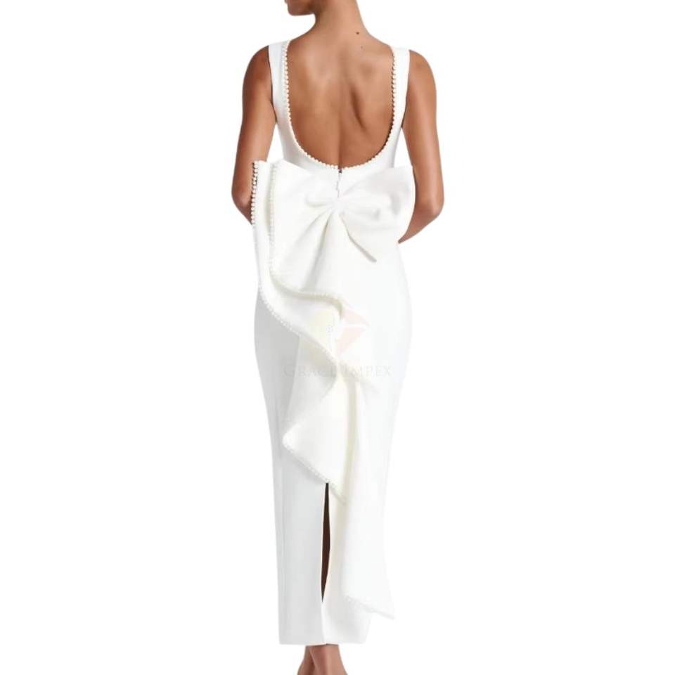ชุดราตรีคอไข่มุกหรูหรา ยาวกรอมพื้น พร้อมโบว์ใหญ่ด้านหลัง แบบไม่มีแขน ทรงเข้ารูป เหมาะสำหรับงานปาร์ตี้ งานพรอม หรืองานแต่งงาน