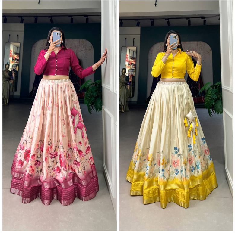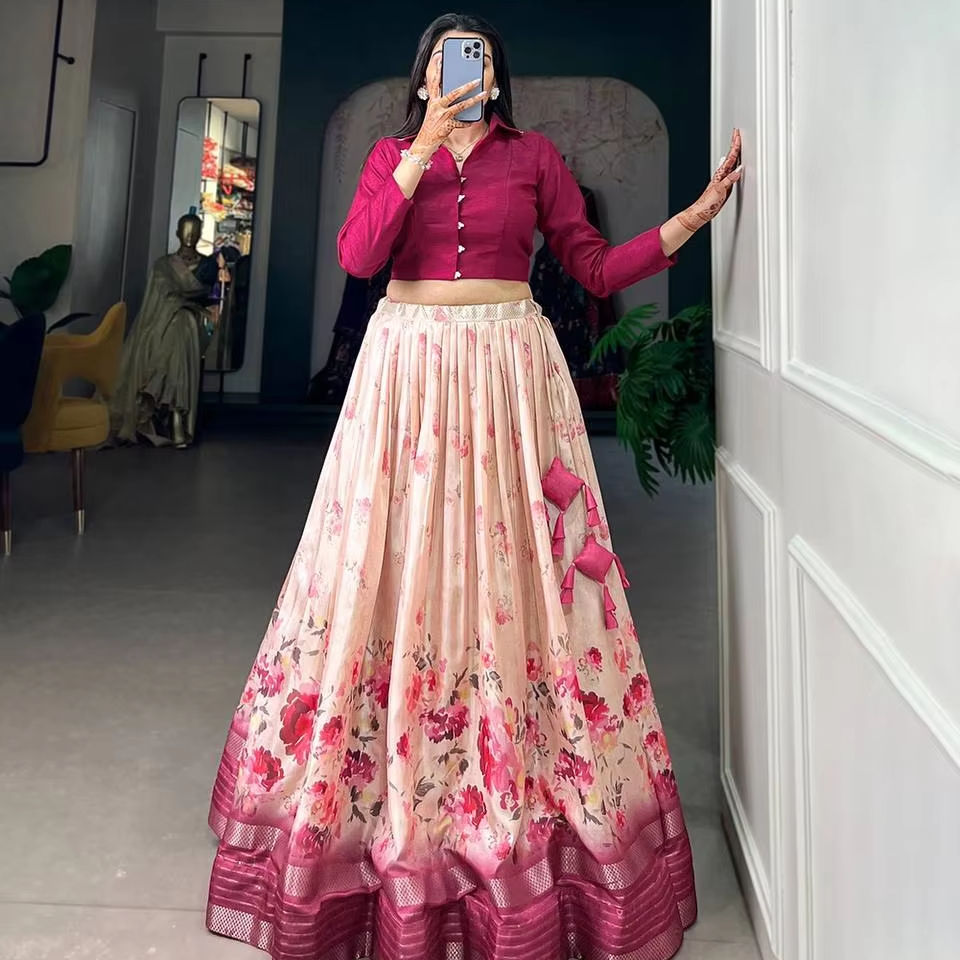 ชุดเลเฮนกาผ้าไหมโดลาสีชมพูหรูหรา พิมพ์ลายดอกไม้ ประดับเลื่อม พร้อมเสื้อแบบแบงกอลลีย์ ยาวถึงพื้น สำหรับงานปาร์ตี้ ความยาว 3.5 เมตร ทรงบาน พร้อมเย็บติดกัน ขายส่ง