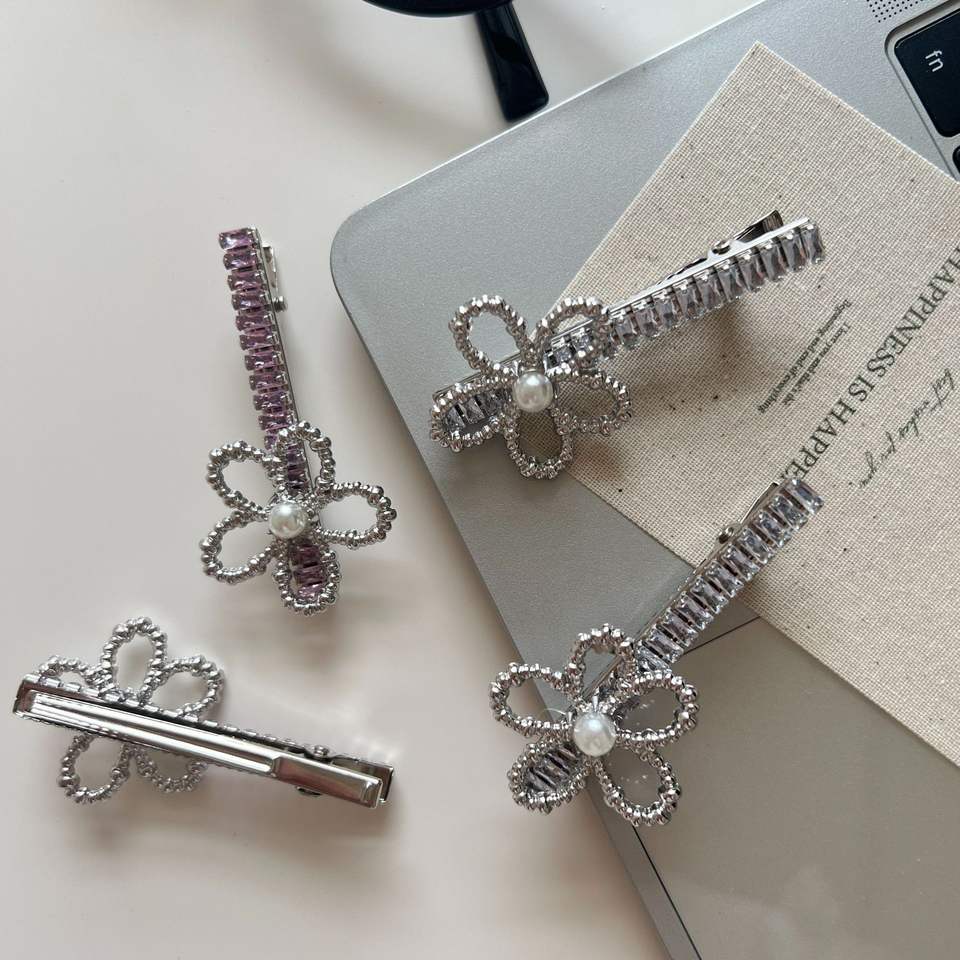 กิ๊บติดผมคริสตัลสีชมพูหรูหรา ประดับมุกหวาน ดอกไม้สไตล์วินเทจ ประดับเพชร