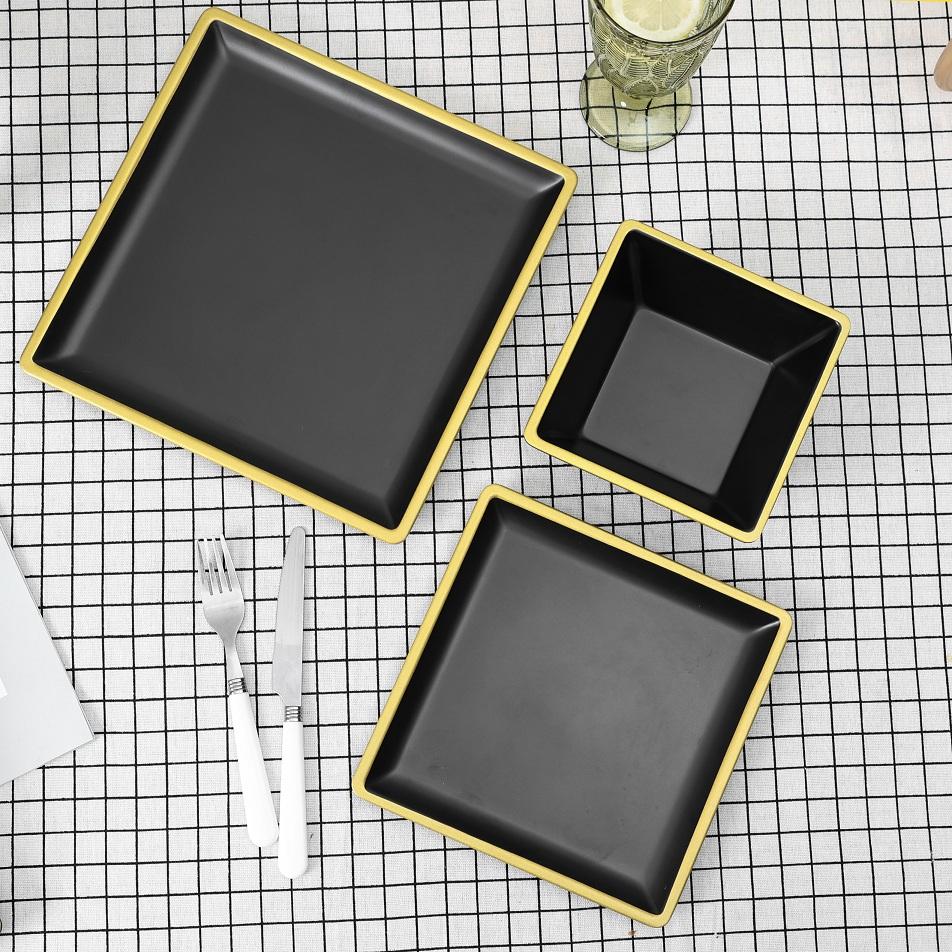 ชุดเครื่องใช้บนโต๊ะอาหารพลาสติกทรงสี่เหลี่ยม,จานของหวานสำหรับปาร์ตี้เมลามีนสีดำพร้อมชุดเครื่องใช้บนโต๊ะอาหารขอบทอง