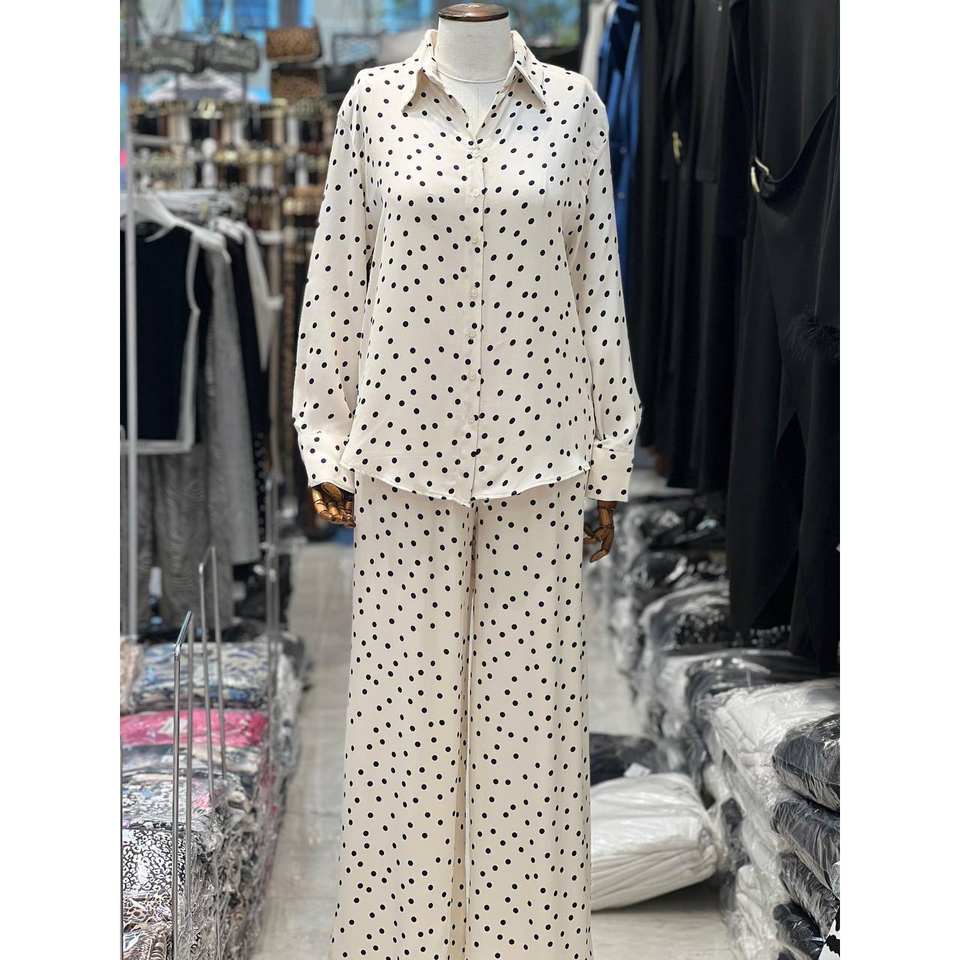 ชุดเสื้อเชิ้ตผ้าซาตินลายจุดสุดหรู แขนยาวติดกระดุม พร้อมกางเกงขายาวสำหรับผู้หญิง ผลิตจากโพลีเอสเตอร์ 100% แฟชั่นทันสมัย