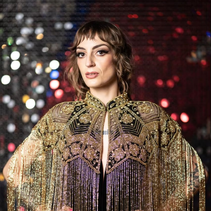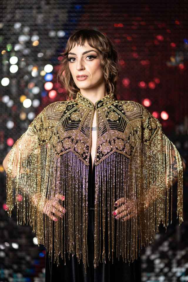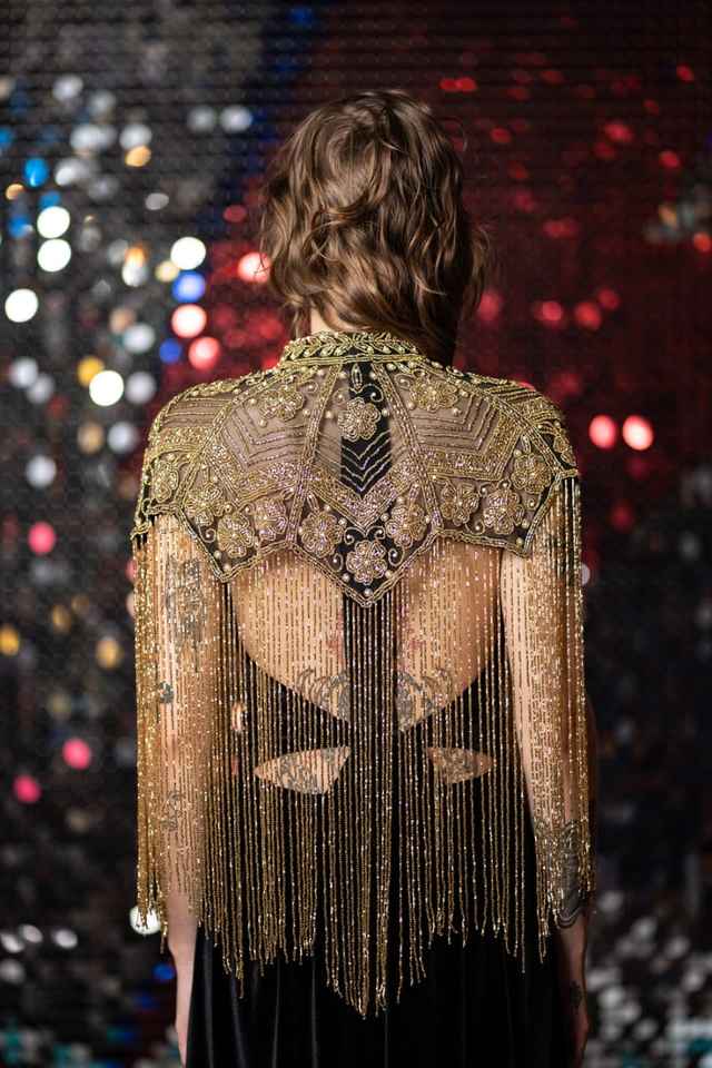 เสื้อคลุมโพลีเอสเตอร์หรูหราพร้อมลูกปัดเป็นเส้นประดับเลื่อมตัวยึดโลโก้ที่สวยงามที่คอสำหรับเทศกาลฤดูใบไม้ผลิและงานเฉลิมฉลอง