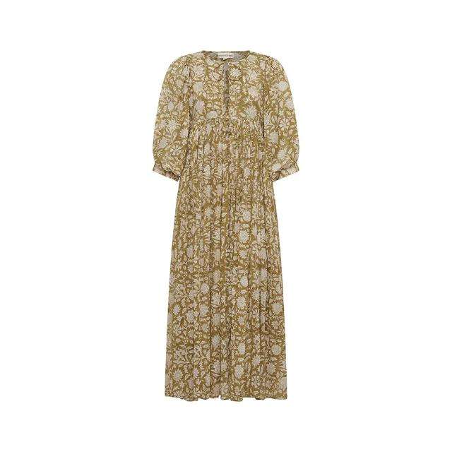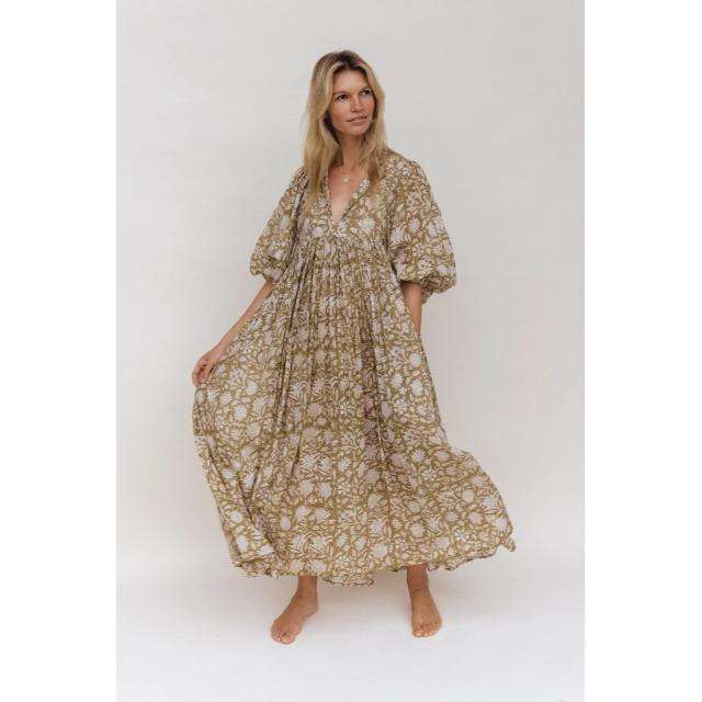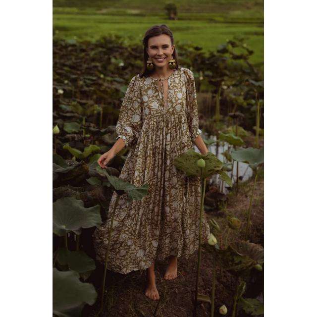 เดรสยาว Kyra ดีไซน์ทันสมัย คุณภาพพรีเมียม สวยหรู สีเขียวมะกอก รุ่นใหม่ ซักได้ ลายพิมพ์ไท-ได