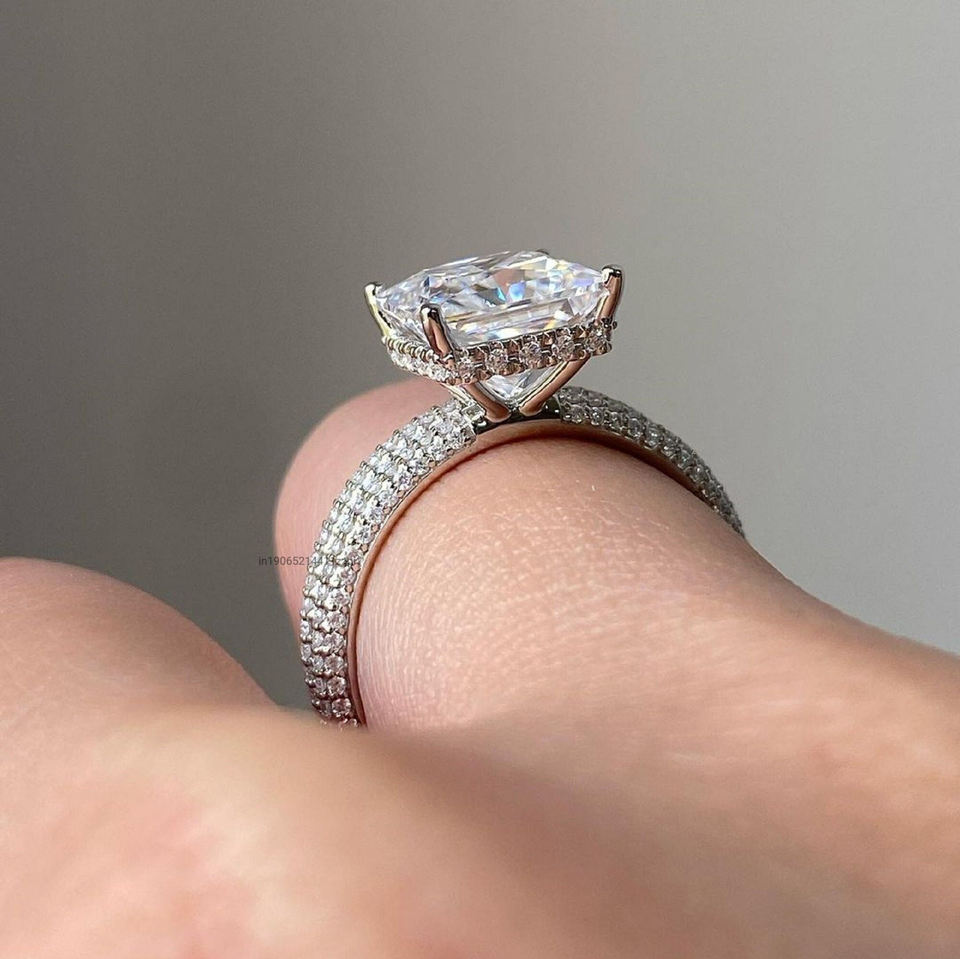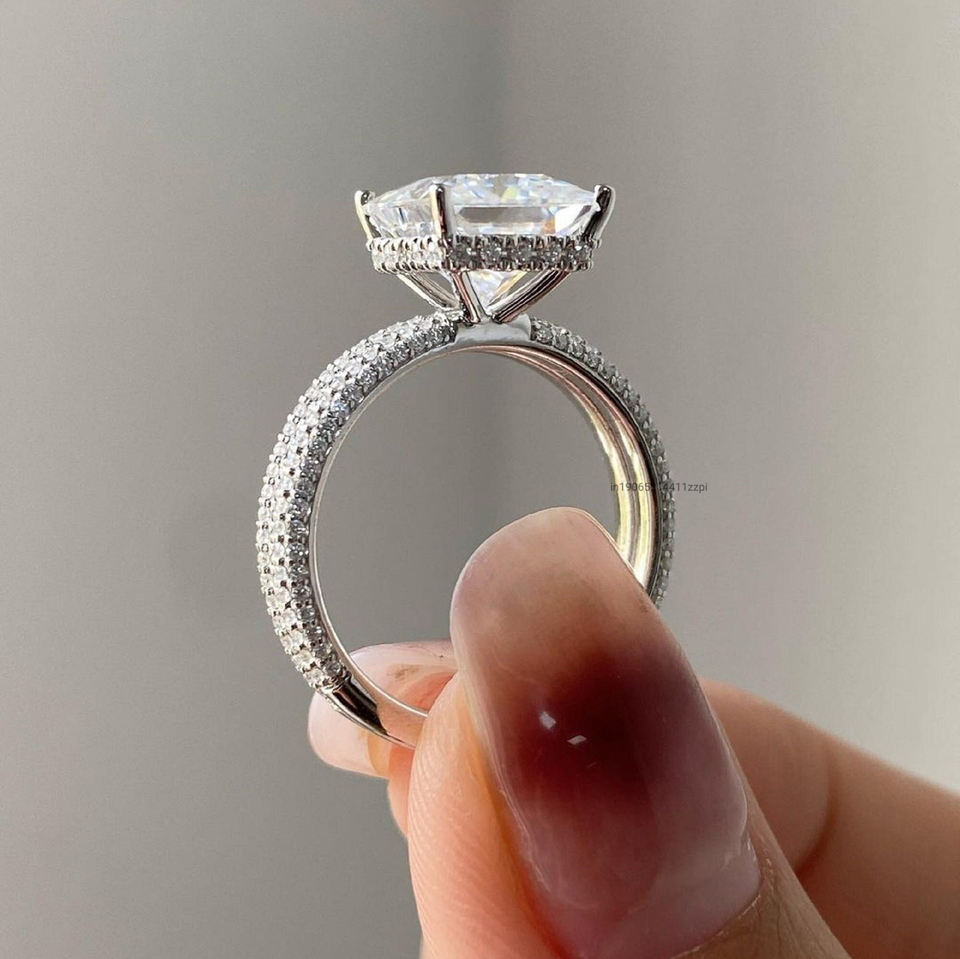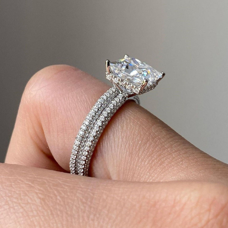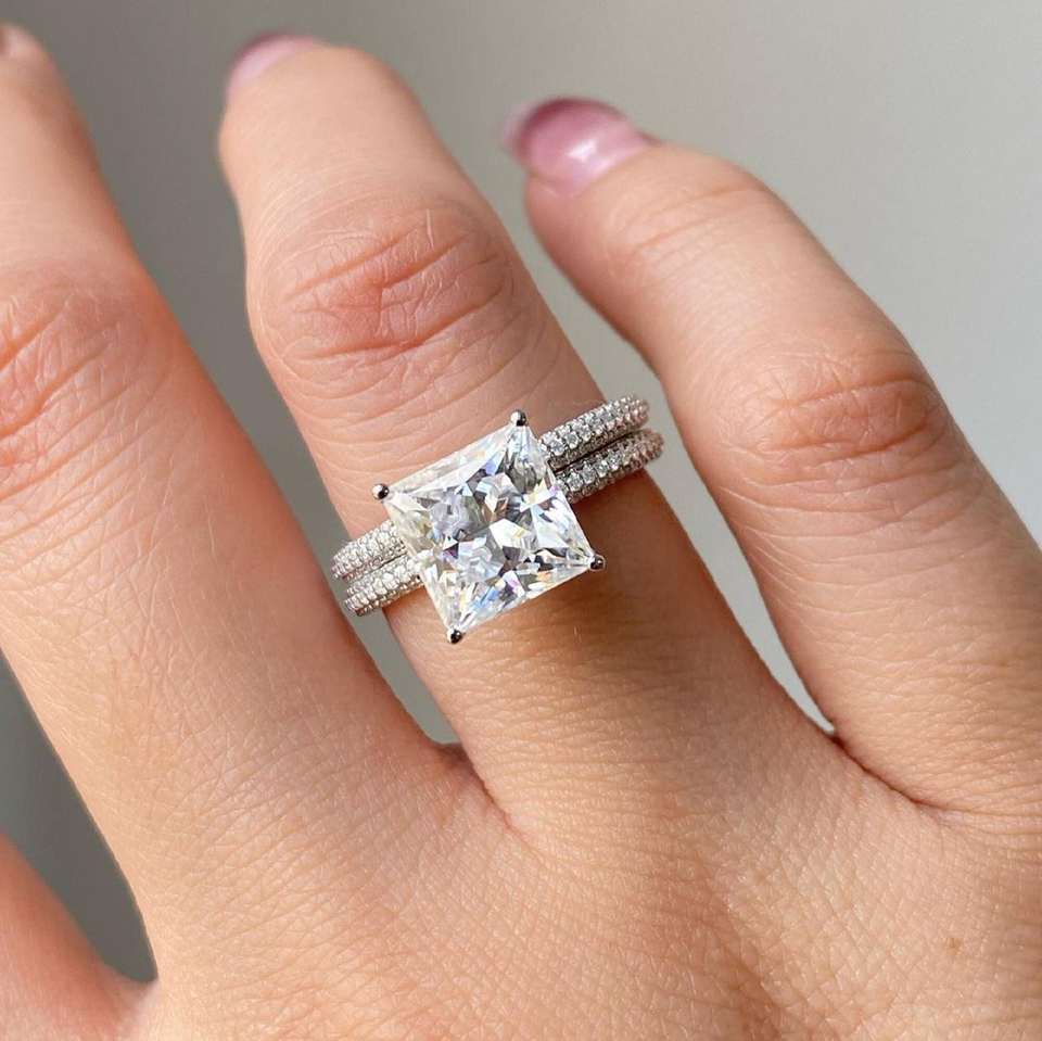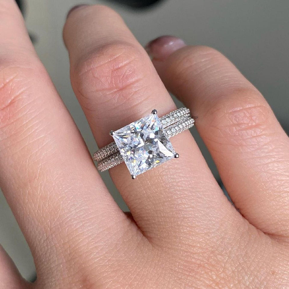 ชุดแหวนหมั้นเพชรโมอิสและแหวนแต่งงานที่ตัดอย่างสง่างามของเจ้าหญิงด้วยหินตรงกลางขนาด7มม. และจับคู่กับวงแหวนสามส่วนที่สี่