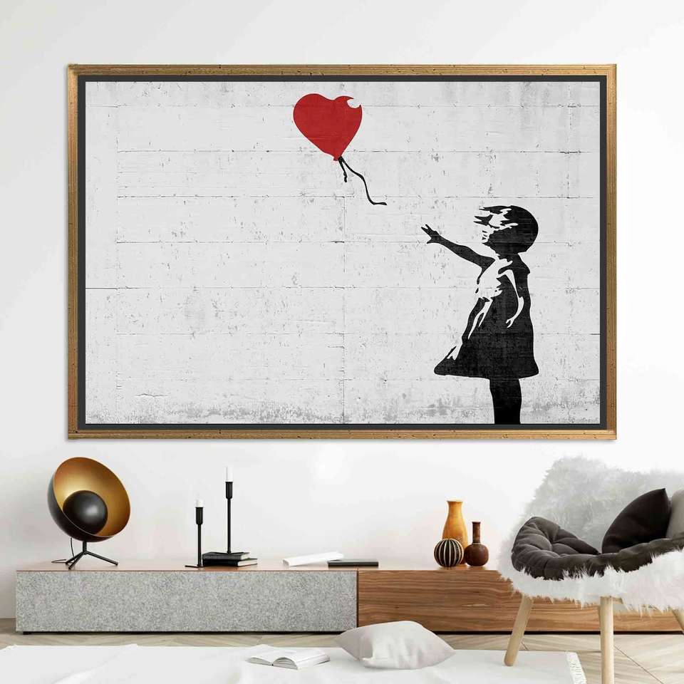 งานศิลปะบนผ้าใบพิมพ์ลายสวยงาม แสดงภาพเด็กหญิงกับลูกโป่งที่โดดเด่นของแบงก์ซี่ พร้อมกรอบสีทอง