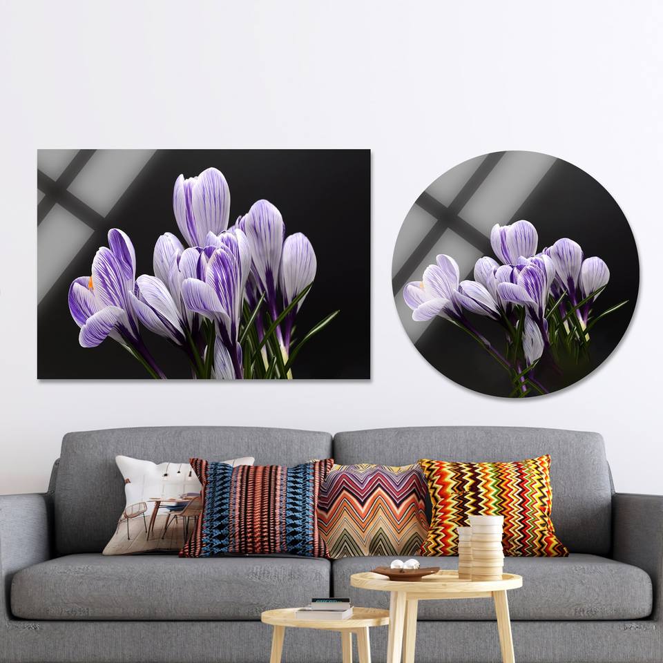 งานศิลปะบนผ้าใบพิมพ์ลายสวยงามที่มีลายดอกโครคัสสีม่วง วงกลมแก้ว