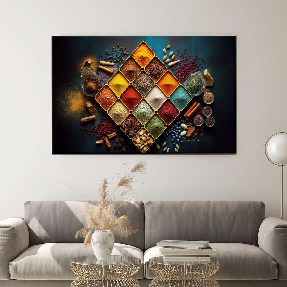 งานศิลปะบนผ้าใบพิมพ์ลายสวยงาม: ดีไซน์จานเครื่องเทศสีสันสดใส,1P:ห่อหุ้มอย่างดี