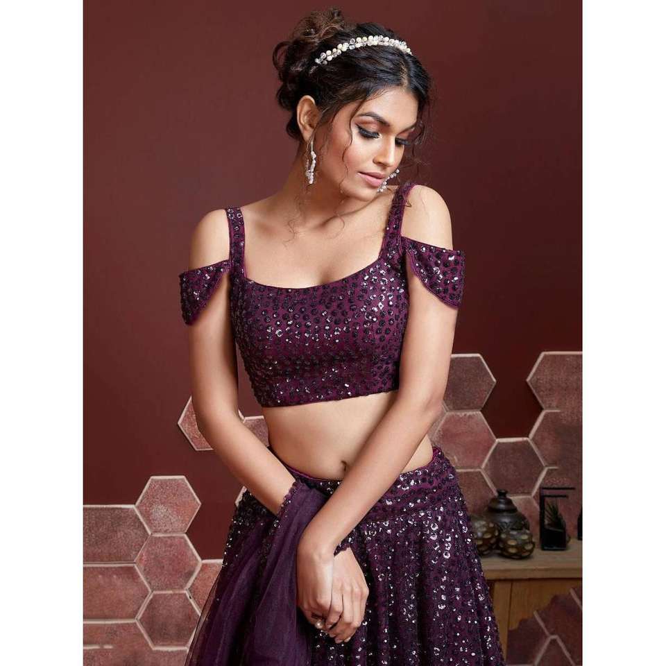 ชุดราตรีตาข่ายปักเลื่อมสีม่วงสง่างามชุดปาร์ตี้ lehenga choli