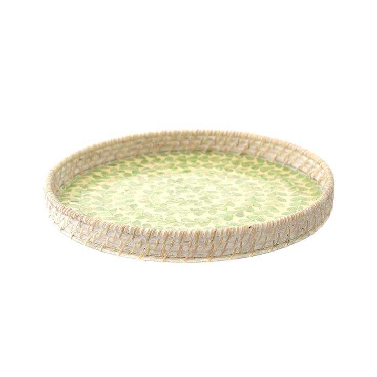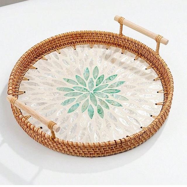 ถาดเสิร์ฟหวายลายดอกไม้ประดับเปลือกหอยมุก สำหรับใช้ในบ้าน ห้องครัว เก็บของ จัดเลี้ยง ถาดวางกาแฟบนโต๊ะ
