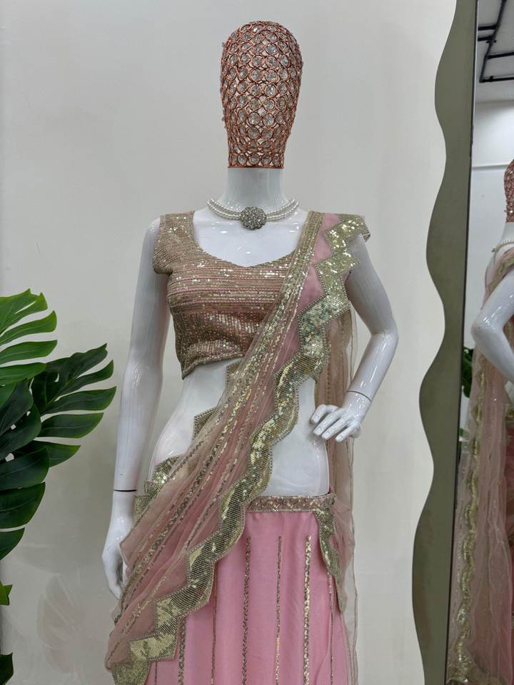 ชุดเลเฮนกา ซารี ผ้าเน็ตเนื้อนุ่ม สไตล์อินเดียและปากีสถาน สำหรับงานเทศกาล พร้อมงานปักดิ้นเลื่อมและเสื้อคลุมแบบยืดหยุ่น