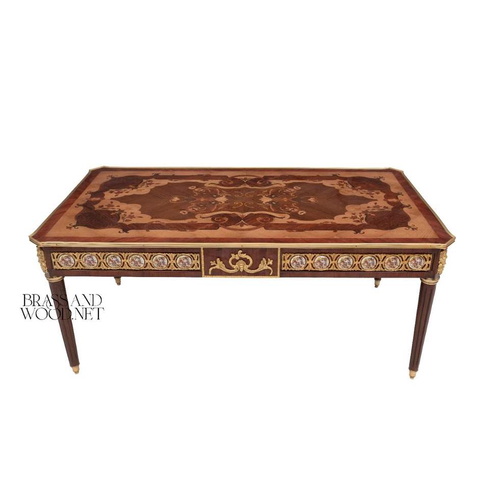 โต๊ะกาแฟทรงสี่เหลี่ยมผืนผ้า ดีไซน์หรูหรา ประดับลายดอกไม้และทองเหลือง พร้อมผิวไม้สีเข้ม ให้ความรู้สึกหรูหรา